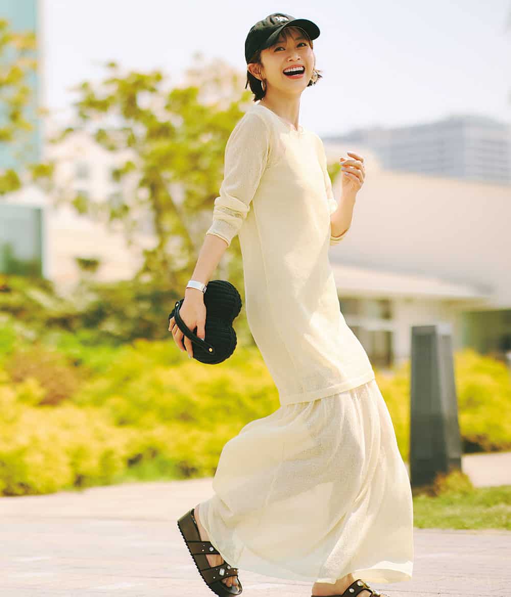 ワンピース¥8,590(ザラ/ザラ カスタマーサービス)バッグ¥35,200(Manimaris)サンダル¥15,400(ダイアナ/ダイアナ 銀座本店)キャップ¥4,620(ニューエラ)ピアス¥58,300(ウノアエレシルバーコレクション/ウノアエレ ジャパン)バングル¥30,360リング¥17,820(ともにアドラル/ZUTTOHOLIC)