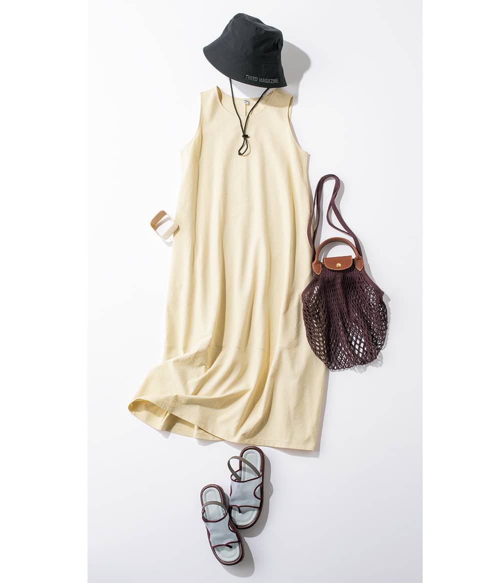ワンピース¥2,990(ユニクロ)バッグ¥19,800(ロンシャン/ロンシャン・ジャパン)サンダル¥15,400(ル タロン グリーズ/ル タロン グリーズ ルミネ新宿店)ハット¥4,950(THIRD MAGZINE × NEWERA/THIRD MAGAZINE)バングル¥8,640(アビステ)