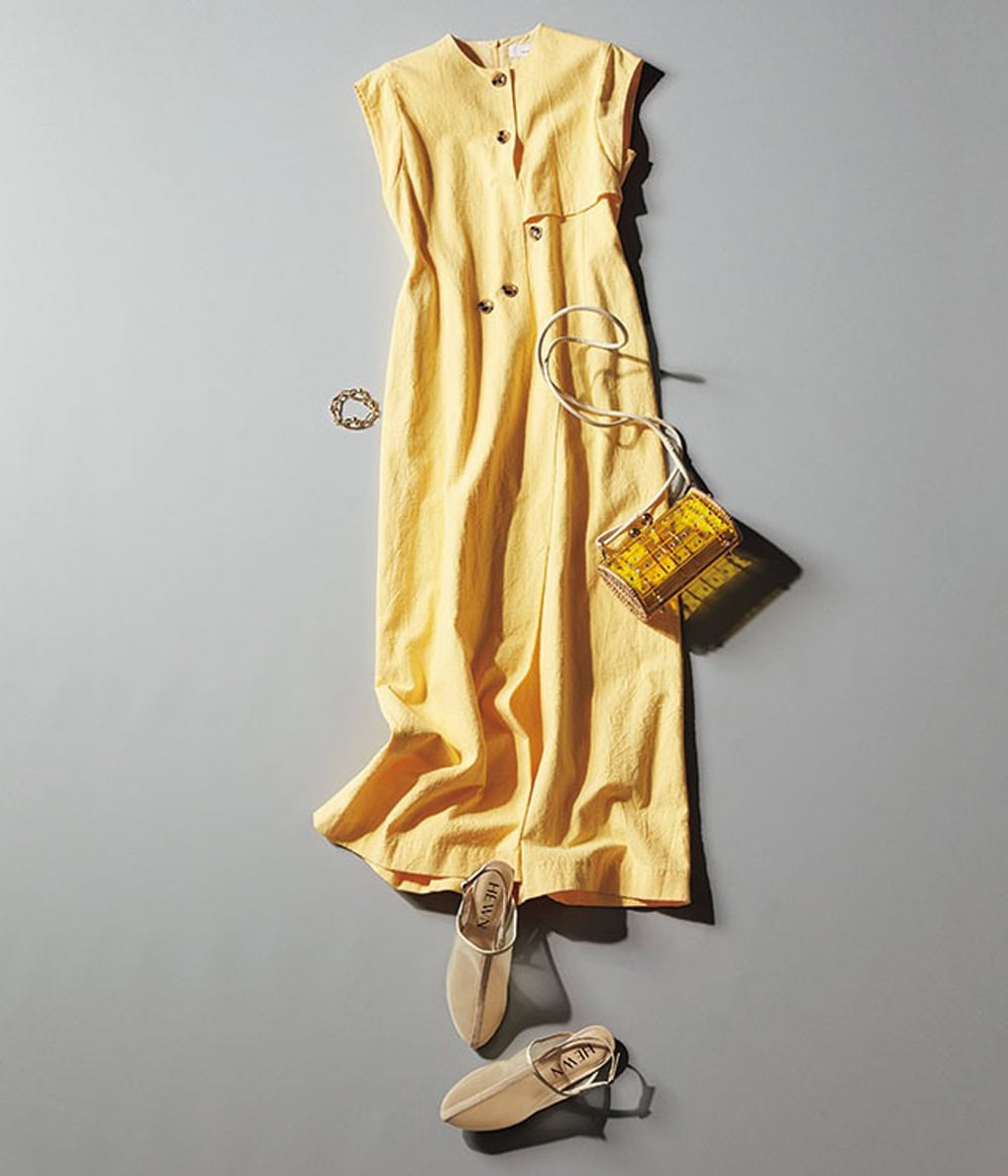 つかの間の非日常を味わえるテラスランチには特別感のある一枚を。日差しに映えるイエローに遊びの利いた小物使いで品よくモードに。足元は肌馴染みのいい旬のシアーベージュパンプスが好相性。