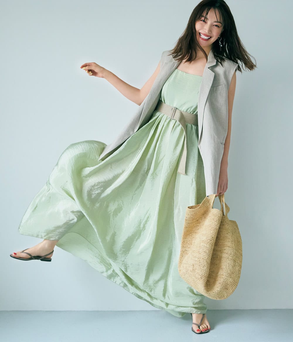 ワンピース¥198,000(アッシュ/コロネット)ジレ¥64,900(サクラ/インターリブ)バッグ¥16,500(メイド イン マダ/ジャック・オブ・オール・トレーズ プレスルーム)サンダル¥28,600(ラオコンテ/フラッパーズ)ピアス¥19,800(ジュスティーヌ クランケ/ザ・ウォール ショールーム)