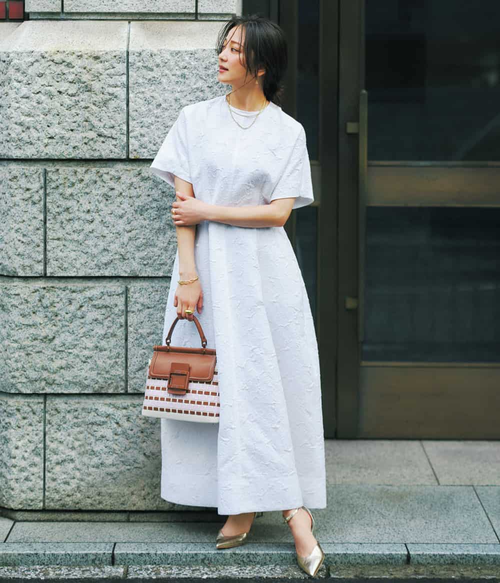 ワンピース¥63,800(アキラナカ/ハルミ ショールーム)バッグ¥89,100(ワイワイ/トゥモローランド)パンプス¥38,500(ヒューン/クルーズ ショールーム)ブレスレット¥99,000(ブランイリス/ブランイリス トーキョー)