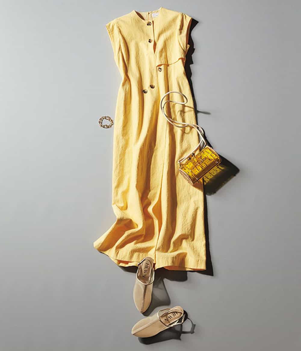 大人の“映え”ワンピはモードと甘さのバランスが鍵。アキラナカのイエローワンピはシンプルながらボタンや切り替えデザインでひねりの利いた一枚。華やかさもリラクシーなムードも欲しい、そんな大人のテラスランチにぴったり。