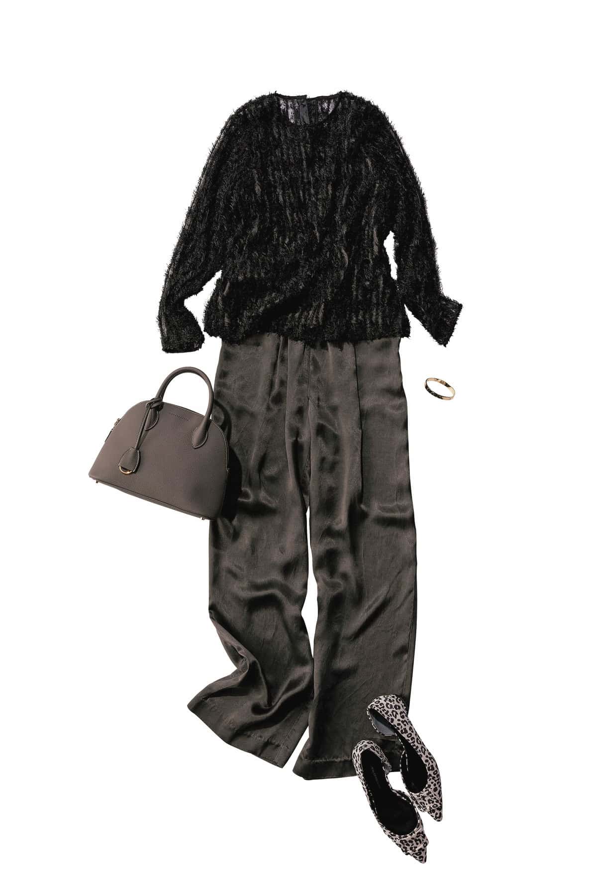 華やかさを保ちつつ、モノトーンコーデにすることで上品な雰囲気に。印象的な形のハンドバッグが差し色になって◎。リングやピアス、ブレスレッドなどのアクセサリーで煌めきを重ねて。