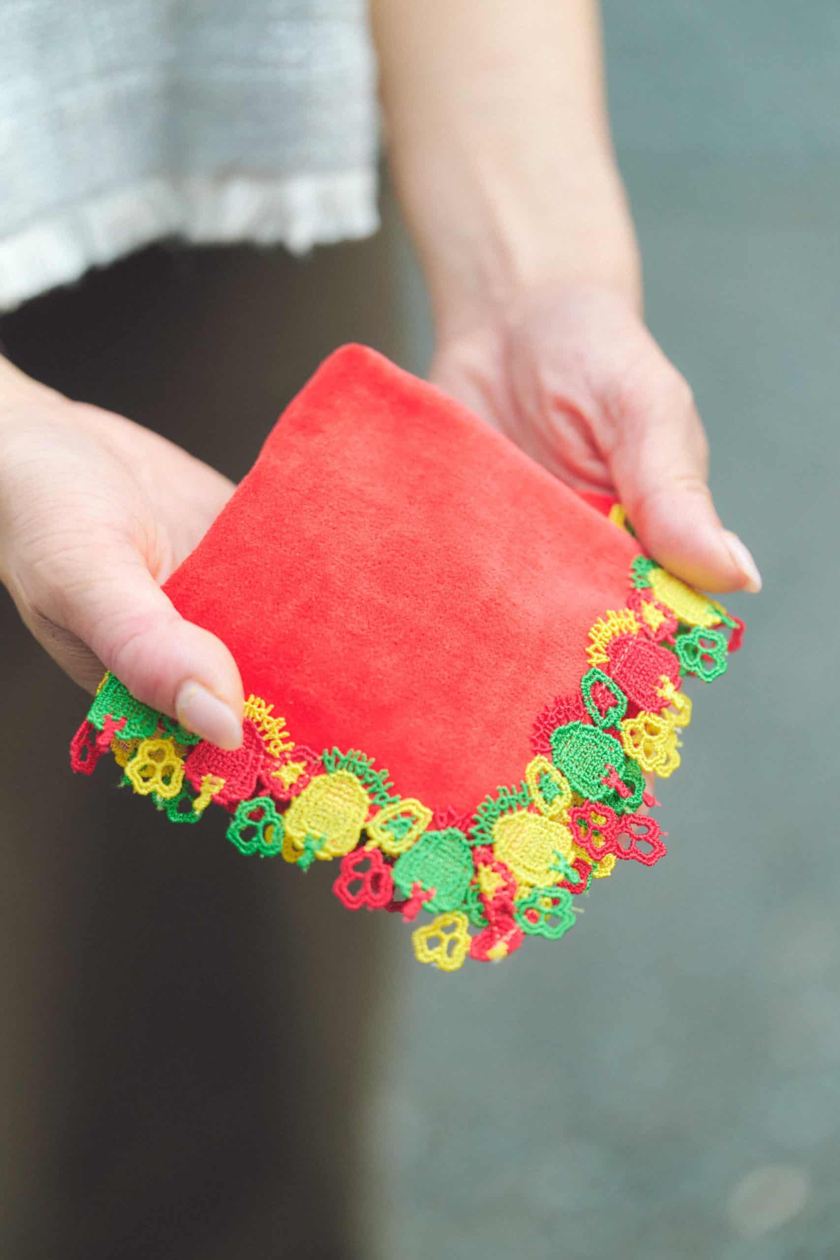 近沢レース店のハンカチは時々出る限定のレースシリーズを集めています!淡い色のハンカチが多い中、こちらはビビットな赤ベースのハンカチにパプリカモチーフのレースが可愛くて購入しました。日常使いにもピッタリで、大人の遊び心あるハンカチなのに上品さをキープできるところがお気に入りです。