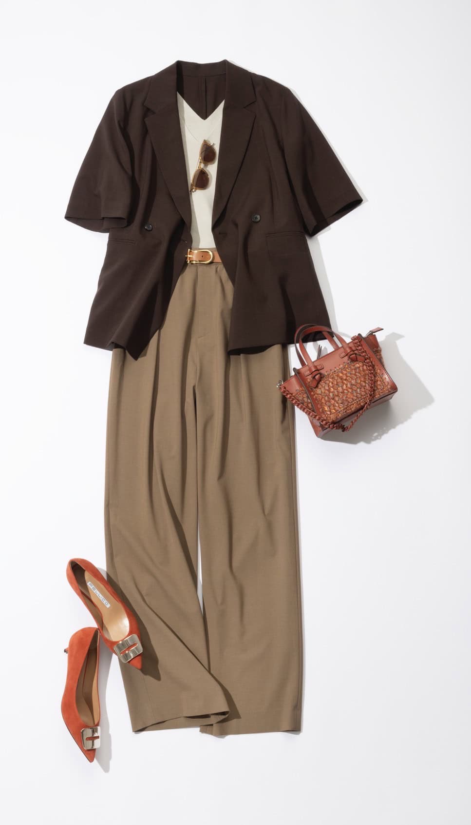 【24℃】とろみ素材の半袖ジャケットも色を茶色にするだけで、ぐん! と秋感が増します。インナーをTシャツからニット素材に変えるだけでも季節感が出ておすすめです。全体を茶系でまとめて、ツイード素材のバッグやスウェード素材のオレンジシューズを合わせればオシャレ上級者に。