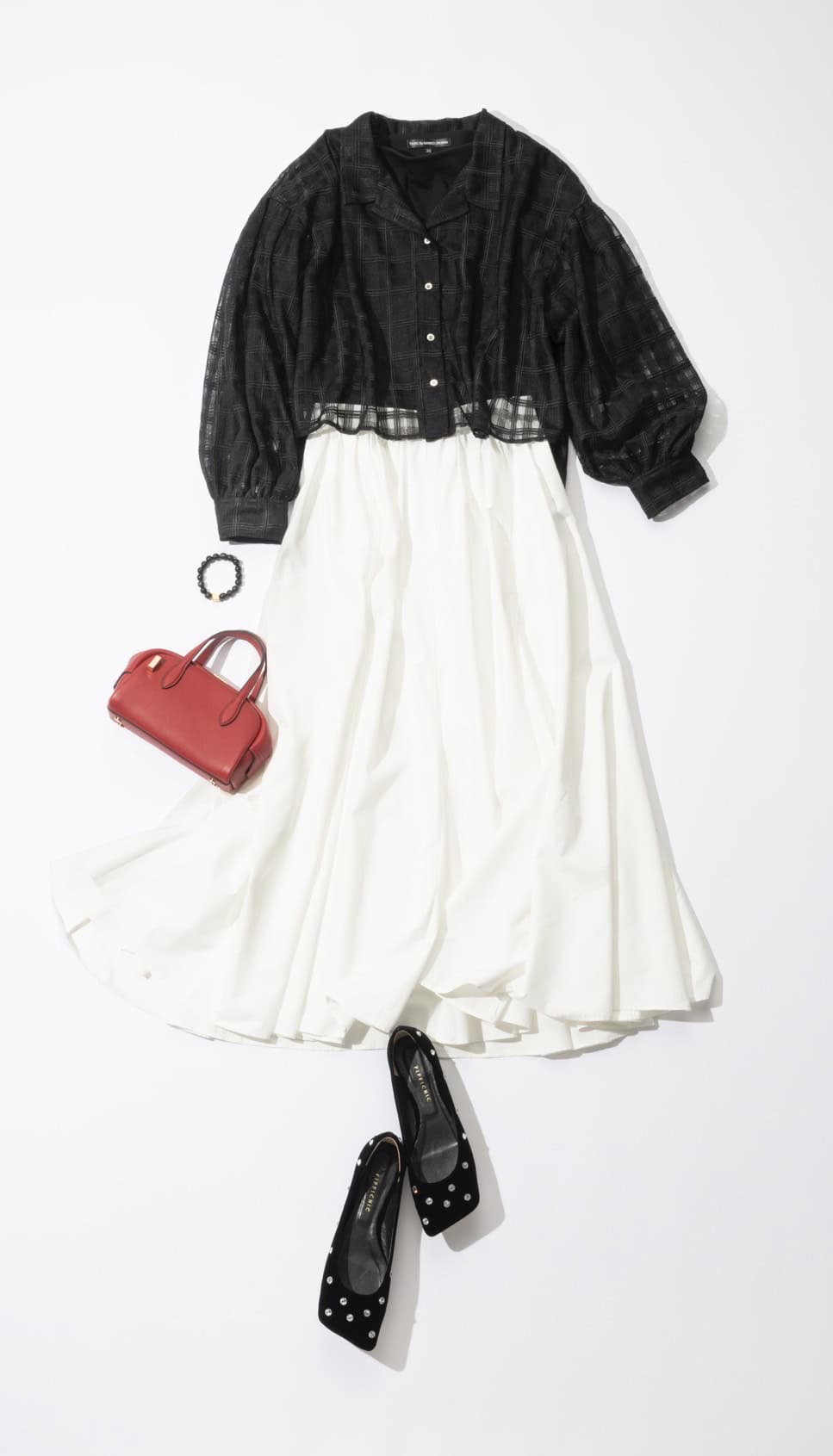 【23℃】長袖カットソーにシアーシャツをレイヤードすれば、黒でも軽やかです。ビジュー付きが可愛いベロアシューズで秋を意識して、旬なピュアホワイトのフレアースカート合わせで、きれいにまとめればホテルランチにもピッタリ。モノトーンコーデに赤のバッグがポイントに。