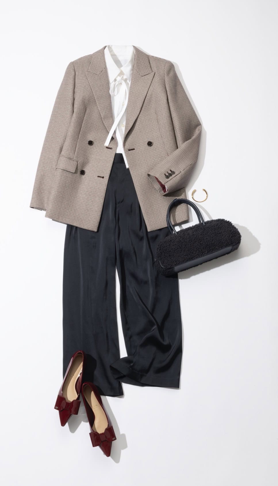 チェックジャケット¥99,000(ANAYI)ボウタイシャツ¥28,600(ティーチ)サテンパンツ¥20,900(アルページュストーリー/アルページュストーリー プレスルーム)ボアバッグ¥14,300(ツル バイ マリコ オイカワ)リボンパンプス¥12,900(チャールズ キース/チャールズ キース ジャパン)バングル¥34,980(ソコ/ZUTTOHOLIC)