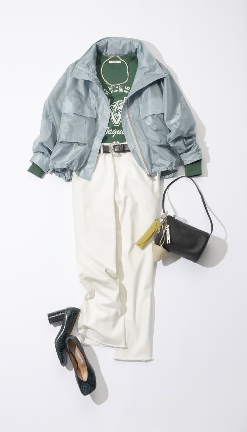 【20℃】日が落ちると肌寒く感じる日はスウェット×シャカブルゾンがあれば安心。ホワイトデニムを合わせて、きれいめカジュアルに。パールのネックレスや、ビジュー付きベルト、パンプスなど小物で女性らしさと遊びをプラスして。
