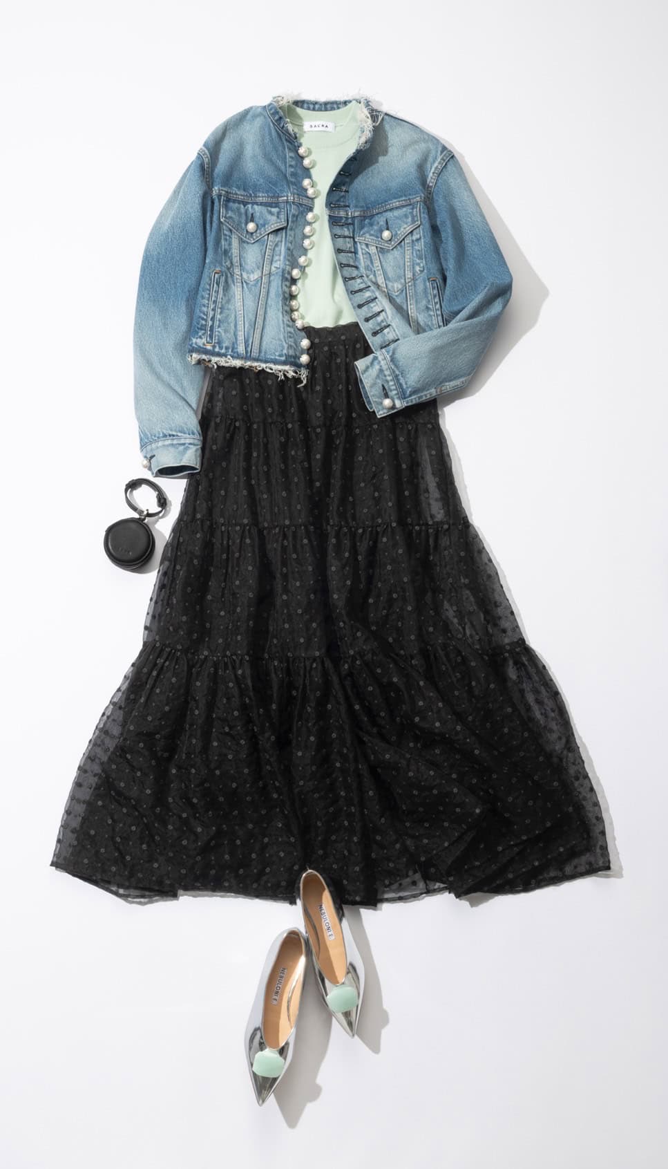パールデニムジャケット¥88,000(チノ/モールド)ニット[10月下旬以降入荷予定]¥29,700(サクラ/インターリブ)ドットシアースカート¥35,200(ウィムガ ゼット/ウィム ガゼット 玉川高島屋S・C店)チャームバッグ¥7,480(リンク)パンプス¥73,700(ネブローニ)