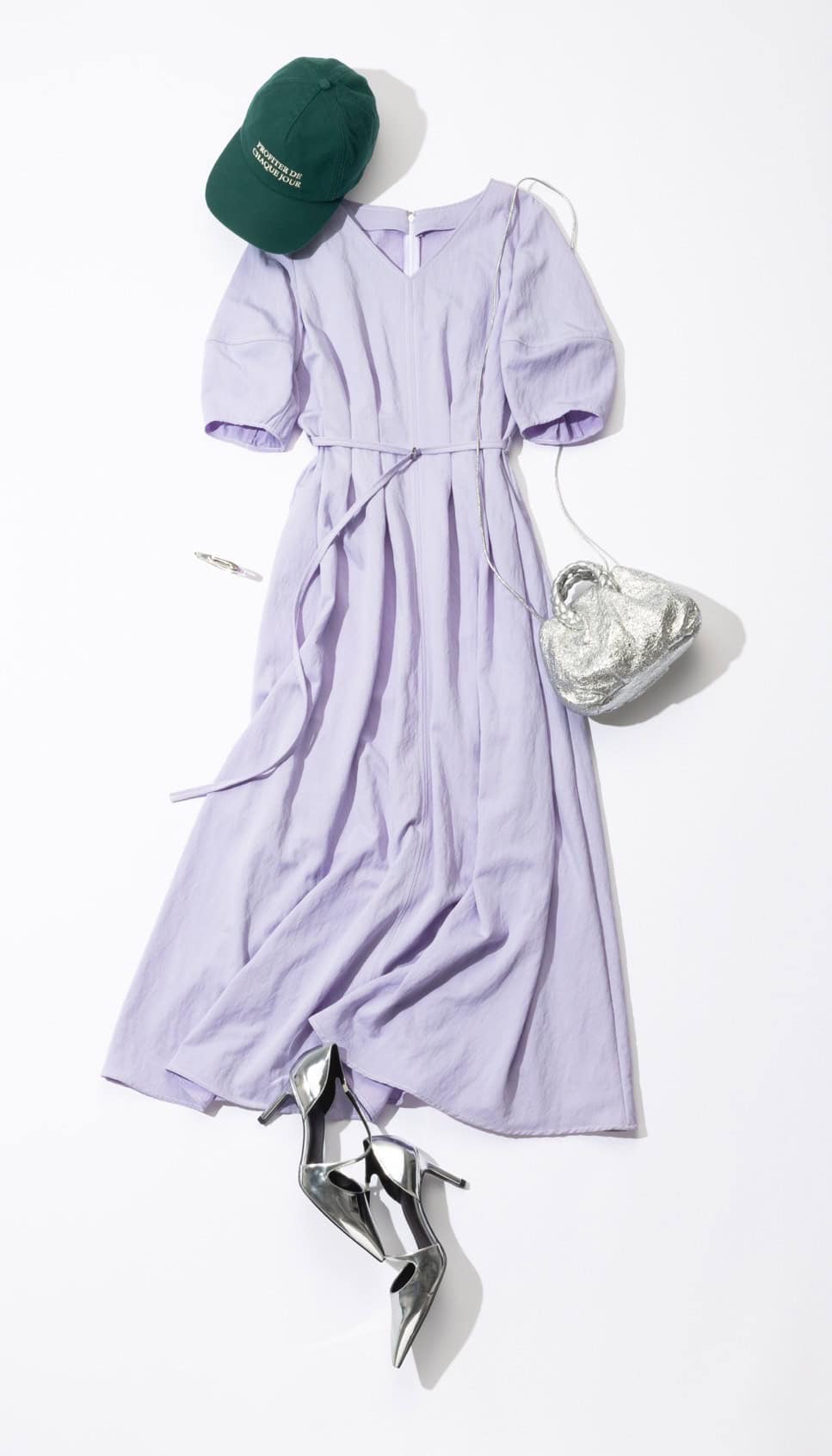 【29℃】1枚で決まるワンピースは、落ち感のある素材で風になびく姿も◎。小物はシルバーで統一してキリっと締めて、日焼け対策にもなるキャップで外せば大人の涼やかワンピースコーデの完成です。