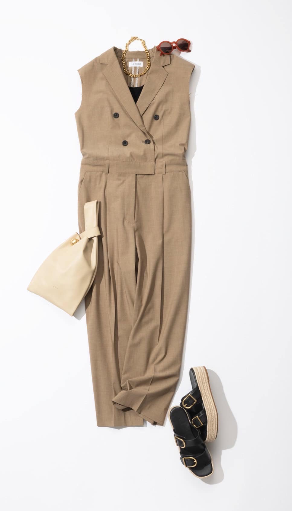【28℃】肩パット入り、ジレ見え、袖口の切りっぱなしデザインと、全方位オシャレ見えが叶うオールインワンなら、暑い日のお出かけコーデにピッタリ。アクセサリーはゴールドで揃えて、インナーと足元を黒で締めれば、更に大人のお出かけコーデに昇華させられます。
