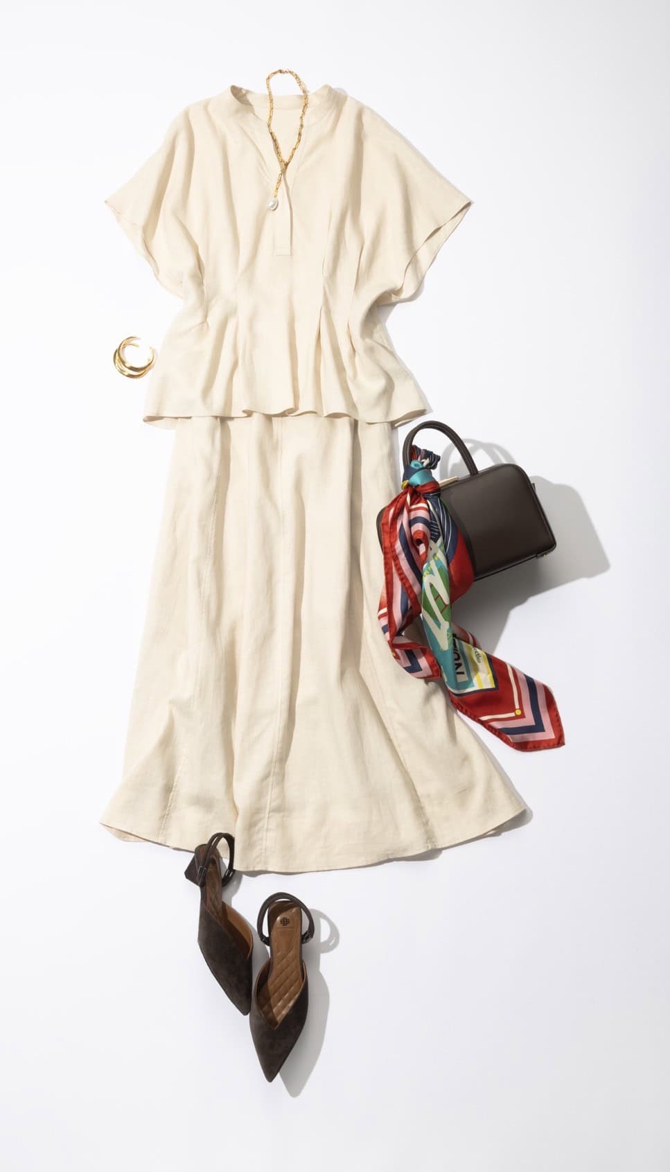 【27℃】さらりとしたリネン混素材のセットアップなら、簡単涼やかコーデの完成。トップスはウエストシェイプのデザインで、スカートは後ろギャザーの広がりすぎない程よいボリュームなので、スタイルアップ効果も◎。優しいカラートーンでまとめれば、女性らしさUP! 小物は茶系で柔らかくまとめて鮮やかなスカーフを差し色に。