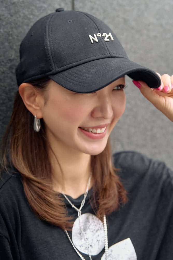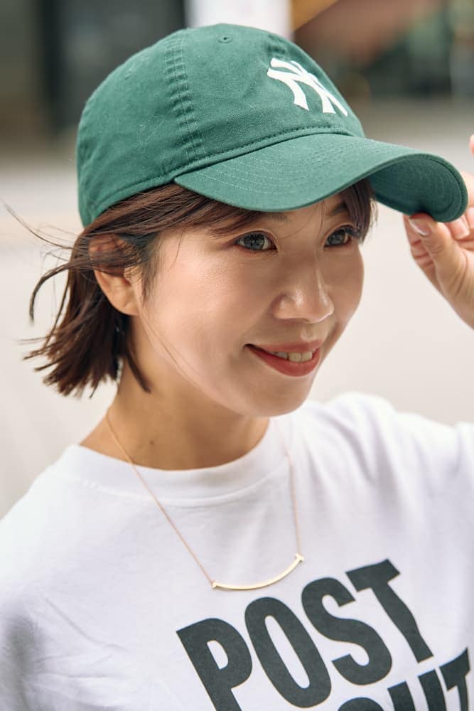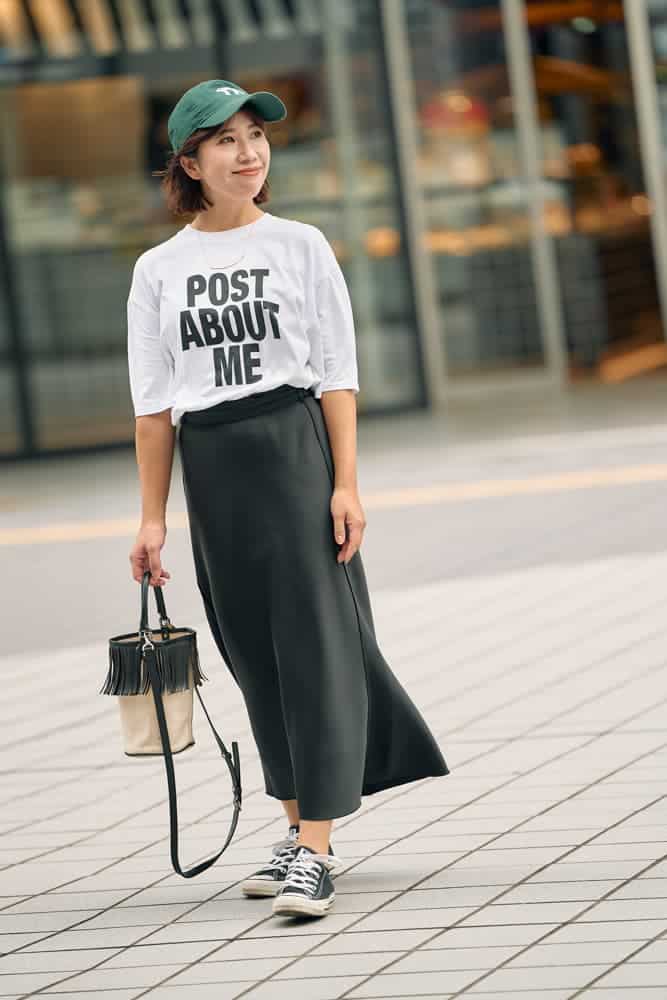 ラフなロゴTにキャップ&スニーカーを合わせたカジュアルスタイルも、サテンのIラインスカートでぐっと女らしく。グリーンのキャップを差し色に、アースカラーを効かせれば、こなれ感もしっかりキープできます。