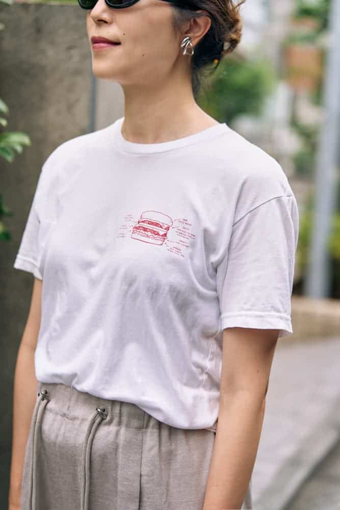 LAの人気バーガーショップ「In-N-Out」のメニュー表が大胆にプリントされたTシャツを主役に、西海岸ムード漂うきれいめカジュアルに。サングラスやラフにまとめたクリップヘアで、こなれ感のある大人のリゾートスタイルに仕上げました。