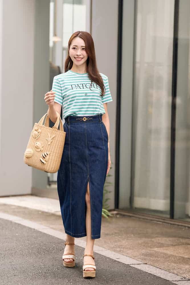 爽やかなグリーン×ホワイトのTシャツに、センタースリット入りのインディゴスカートを合わせた、きれいめカジュアルな大人の夏コーデ。ロゴや濃淡の効いたカラーコントラストがアクセントになり、スリットからちらっとのぞく肌で抜け感を出しています。貝殻やヨットモチーフの遊び心あるバッグや、大ぶりのフラワーピアスで、華やぎもプラスしました。