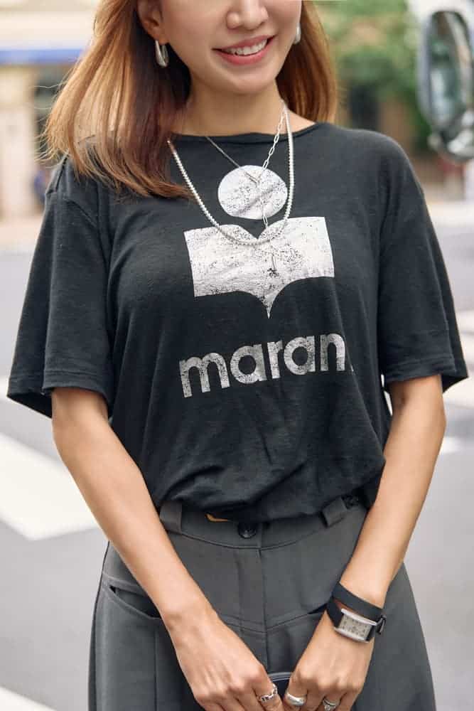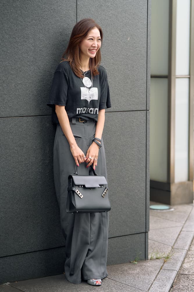 シルバーのロゴが効いたイザベルマランの黒Tはほんのりロックっぽい要素があるので、大人っぽくなるようきれいめアイテムとミックスしてバランスを取りました。アクセサリーはシルバーで統一、小物もブラック×シルバーをセレクトし、洗練されたモノトーンスタイルに仕上げました。