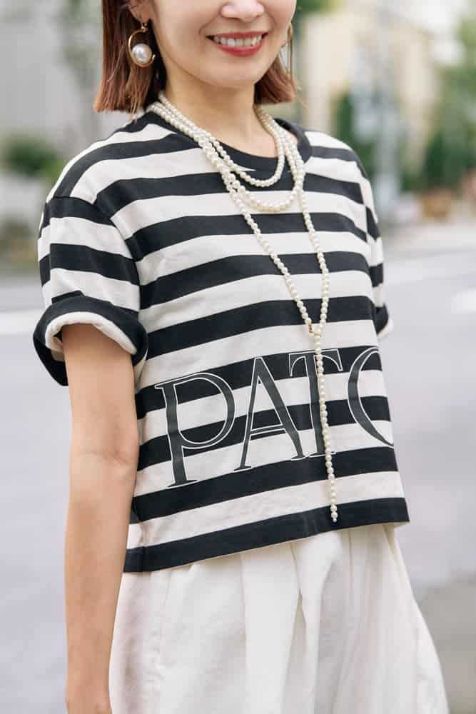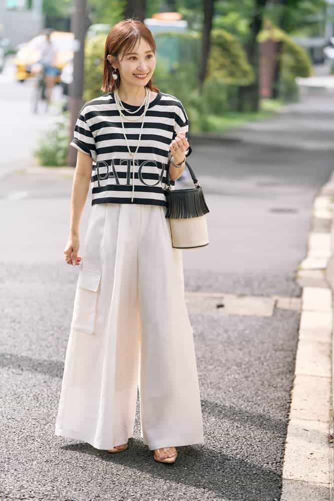 ショート丈Tシャツにスカート見えするカーゴワイドパンツを合わせたコーデは、脚長効果がありスタイルアップが叶います。そのうえ動きのあるパンツと太めボーダーがモノトーンコーデに奥行きを与えてくれます。ボーダーのトップスを着た時は、パールジュエリーを合わせて少し甘さをプラスするのがポイント。