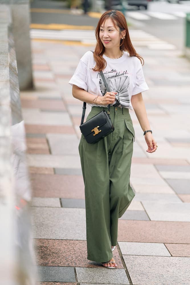 大きめポケットがポイントのカーキミリタリーパンツ&Tシャツはカジュアル要素たっぷりなので、華奢なサンダルとゴールド金具のバッグを合わせることでキレイめな印象に仕上げています。夏はTシャツコーデが多くなりますが同じTシャツでも合わせる小物やボトムスで印象が違って見えるので、コーデを考えるのがより楽しくなります。