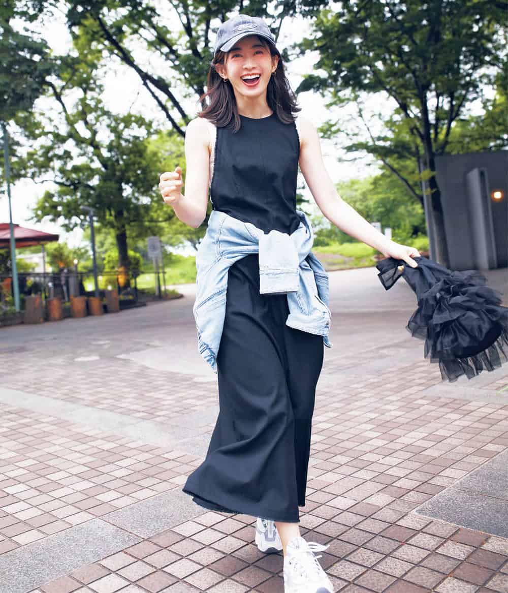 着こなし次第で表情が変わる黒ワンピースは夏のオシャレの見せどころ。子どもとのアクティブなお出かけDayはキャップ&スニーカーを合わせたフッ軽コーデで。ざっくり開いた脇部分から白タンクトップをチラ見せして抜け感をプラス。