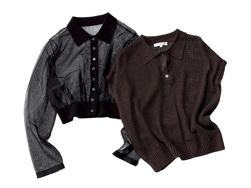 (左から)クロップドシアシャツ¥6,930(STYLEMIXER)ブラウンメッシュニットポロ¥4,398(グローブ/ワールド プレスインフォメーション)