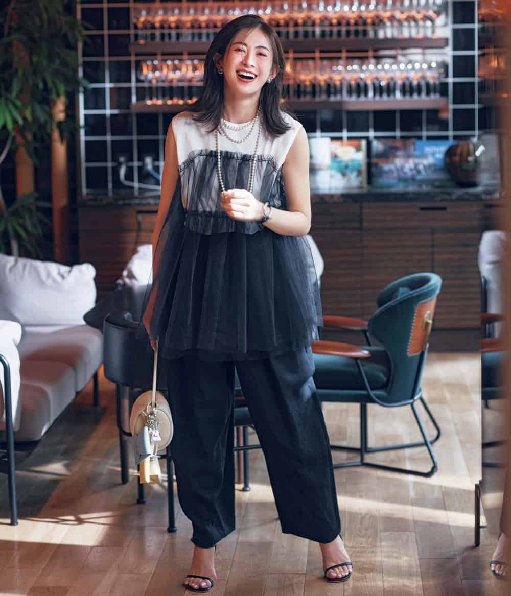 黒のバレルパンツにデコラトップスを合わせて夜のレセプションへ。ほのかなカーヴィの今っぽシルエット×安心感のあるツータック、程よいハリ素材でカジュアルもきれいめもいける守備範囲の広さが秀逸。ワンツーコーデもパッとモードに仕上げてくれるから忙しい朝の救世主的存在に。
