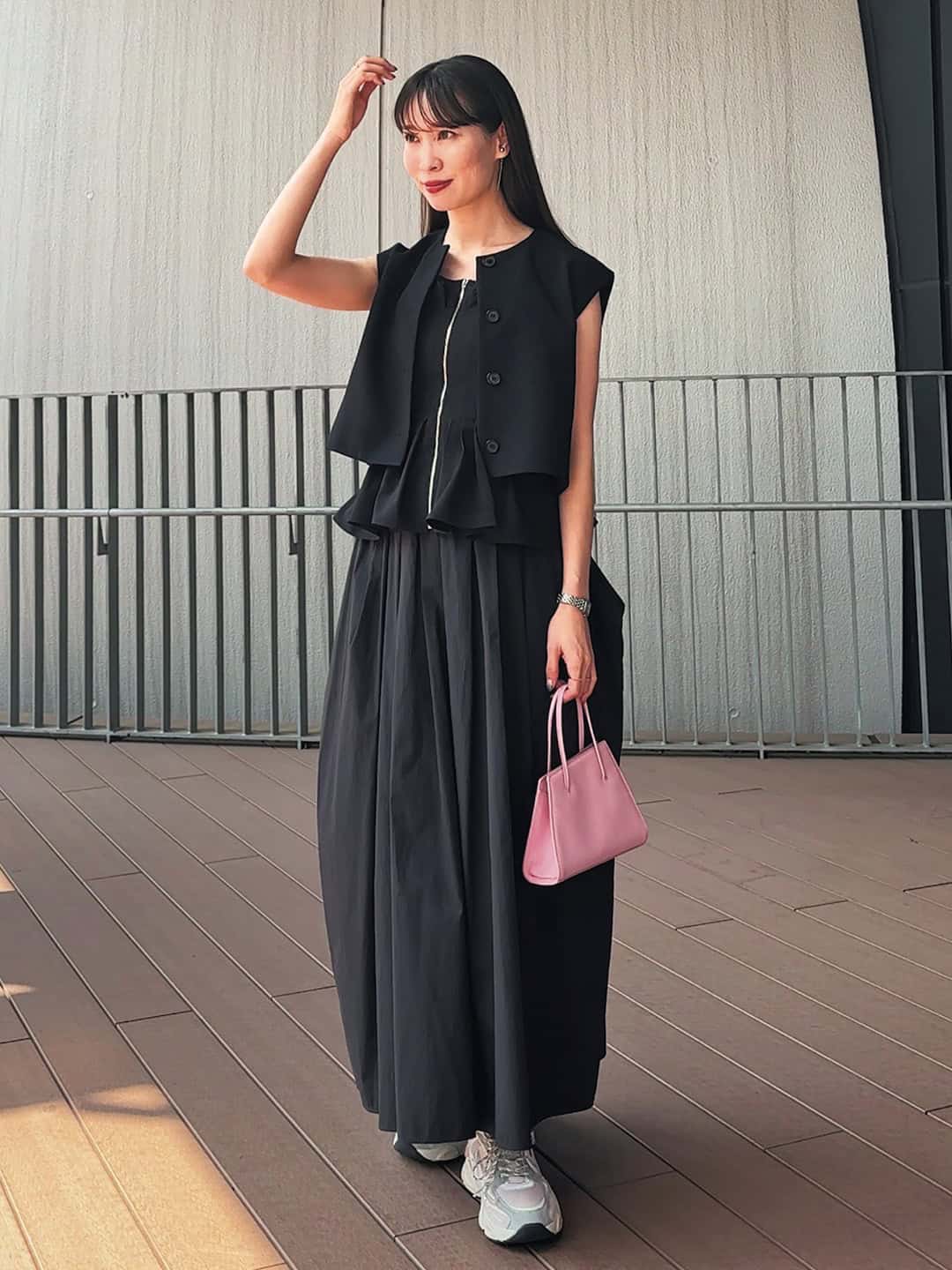 黒のオールインワンは万能で、季節を問わず着られるから、ついつい手に取りたくなる一枚です。OFFの時間を楽しみたい日は、ピンクのバッグでアクセントをプラスしています。