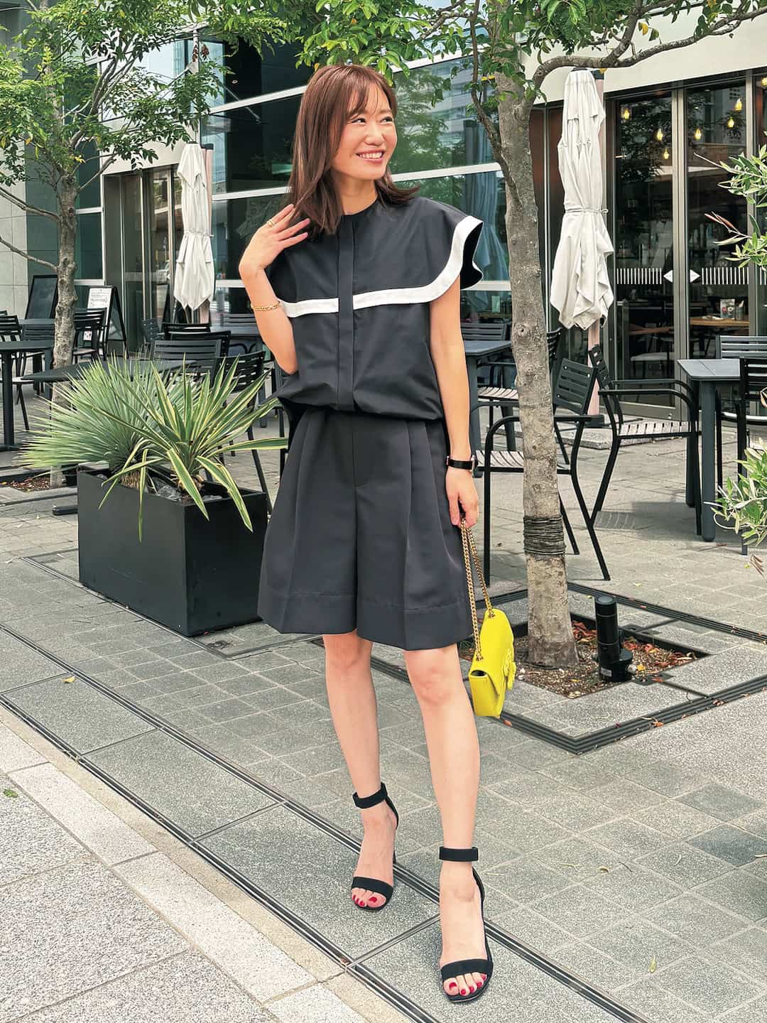 イエローのバッグはCELINEのもの。カジュアルになりがちなハーフパンツも、黒でまとめてヒールを合わせれば、ランチシーンにも対応可能に。