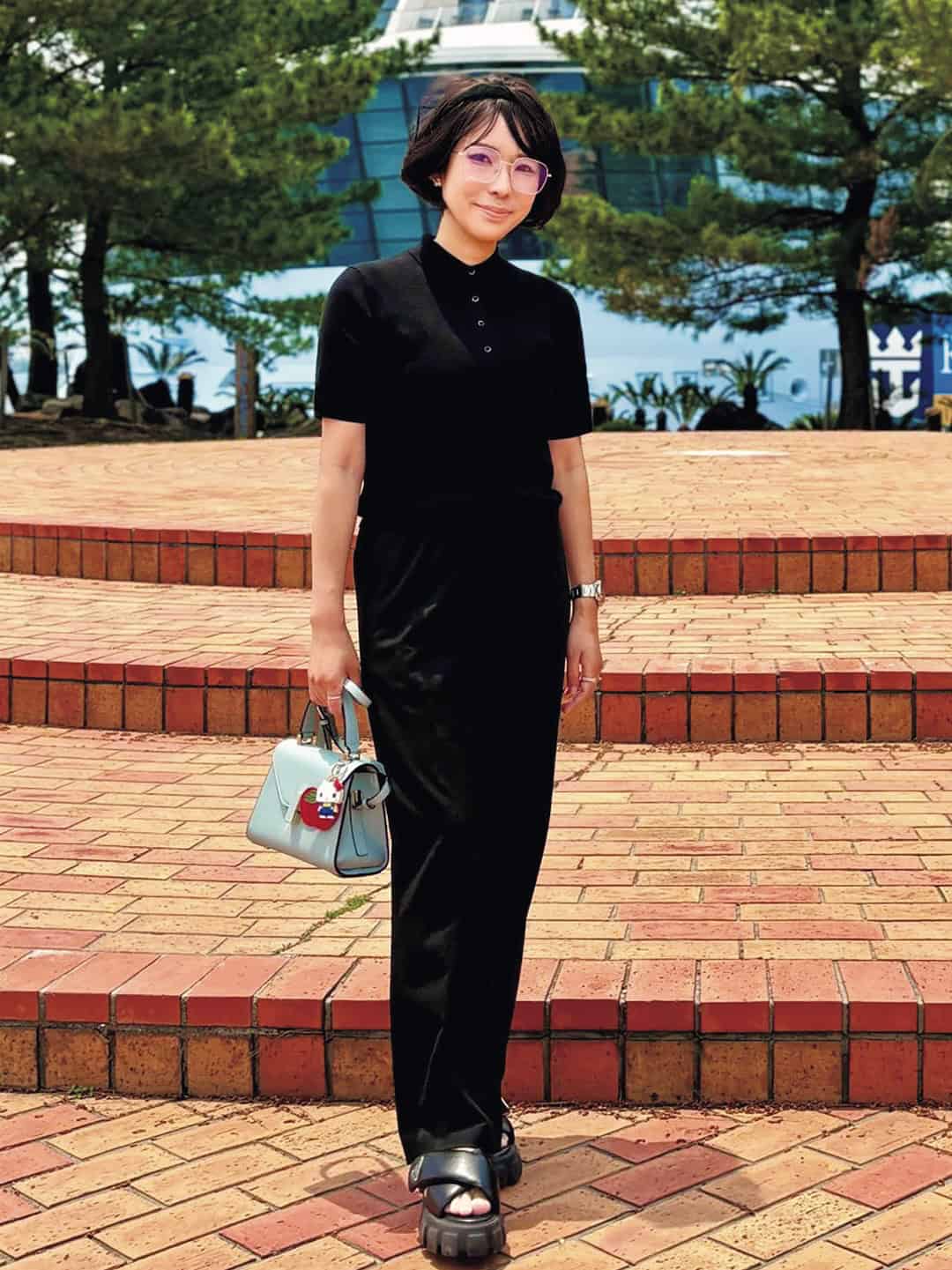 差し色には、推しのメンバーカラーをさりげなく取り入れて、密かに推し活も楽しんでいます。トレンドのポロシャツは、ニット素材ならカジュアルになりすぎず着られるのが気に入って購入しました。ボタンはすべて留めて、今年らしいメタルフレームのアクセサリーで、オールブラックコーデにアクセントを。