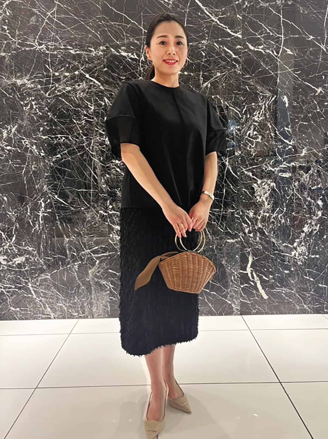 仕事にもプライベートにも使える“黒”は、私にとって頼れる強い味方。スカートは、丈感と素材の可愛さに惹かれて衝動買いしたお気に入りアイテム。トップスは涼しげで上品な袖デザインが、コンサバ派の私の好みにぴったりで購入しました。そんな”お気に入り同士”を組み合わせてもまとまりが生まれるのが、黒コーデの魅力。毎日、その着回し力に助けられています。