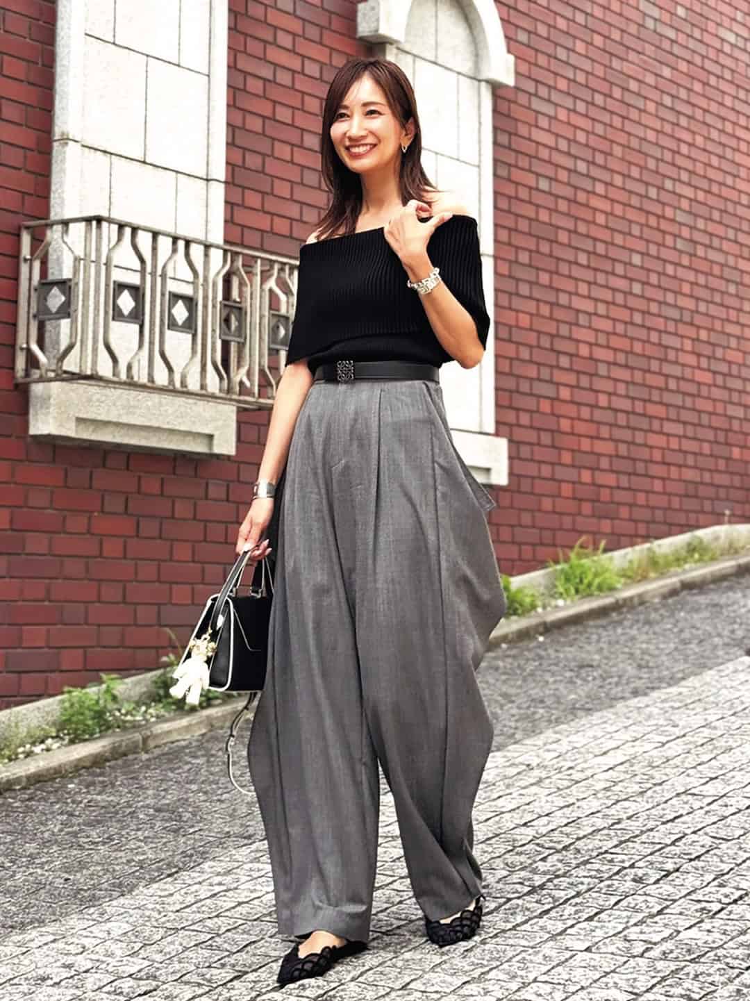 Cygneのパンツは、デザイン性が高くモードにも振れる万能アイテム。一目惚れして購入しました。パンツを主役に、トップスは旬なオフショルで抜け感を演出。セルジオ ロッシの、透け感のあるデザイン性シューズを合わせて、モードな夏コーデで撮影に出かけます。