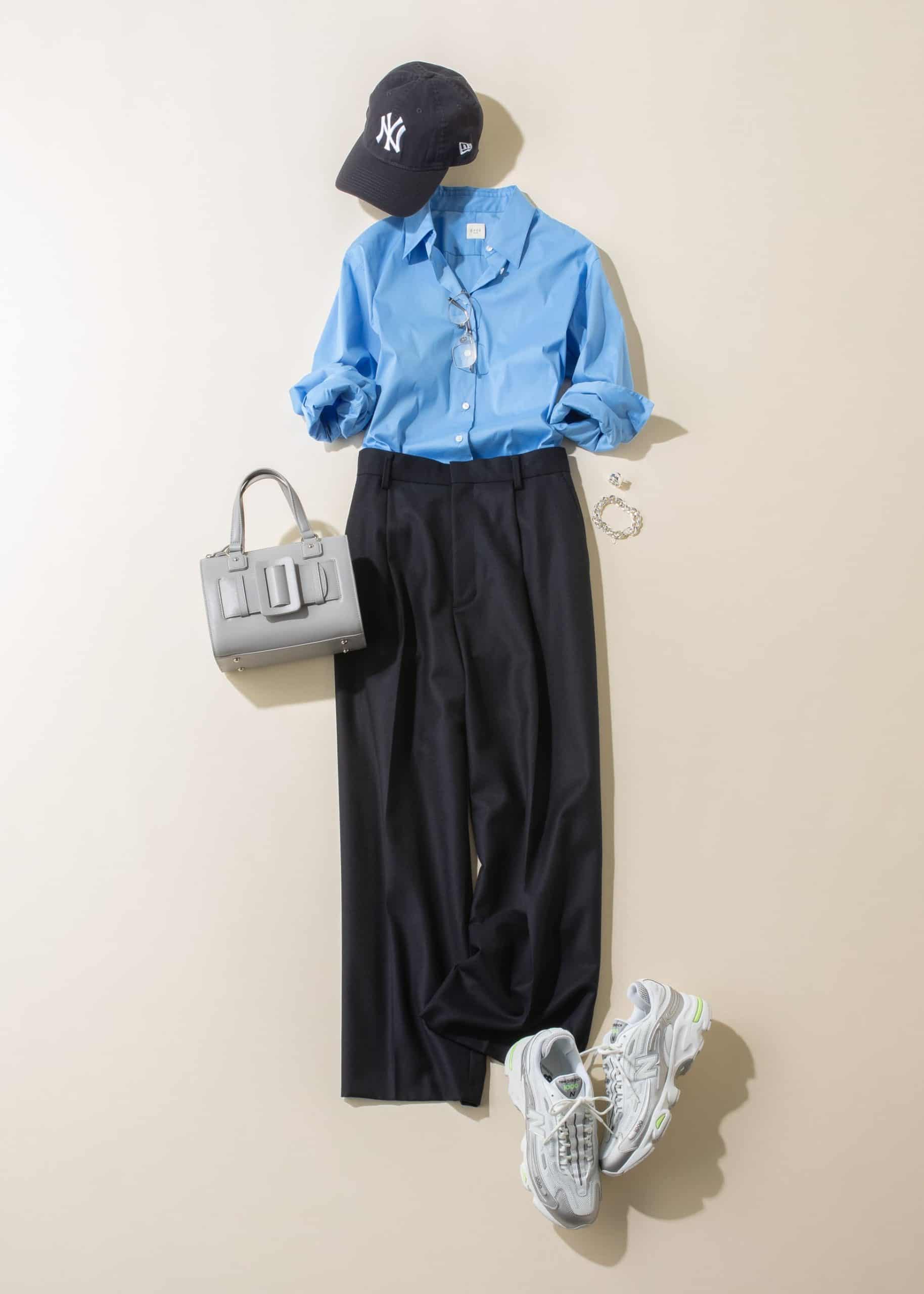 端正なブルートーンのコーディネートをカジュアルに着こなすなら、足元はシルバースニーカーがおすすめ。品をキープしたまま抜け感のあるコーディネートが完成します。キャップの外しがこなれたアクセントに。