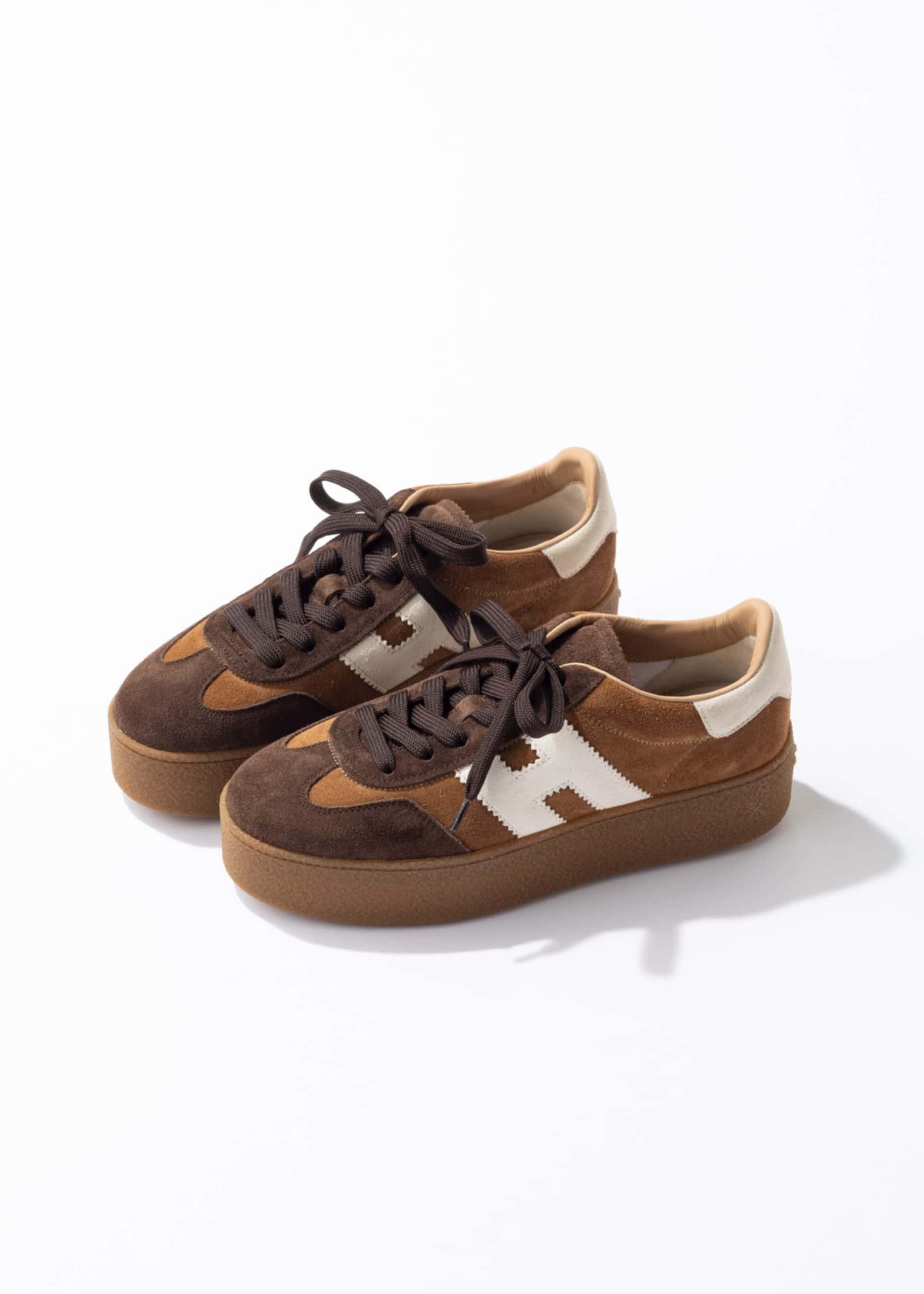 島元さん「再上陸のHOGANは秋らしいブラウンのスエードのアッパーと厚底が魅力的。ブラウンのセットアップに合わせてもカジュアルになり過ぎず、品よく秋らしさを演出できます。」