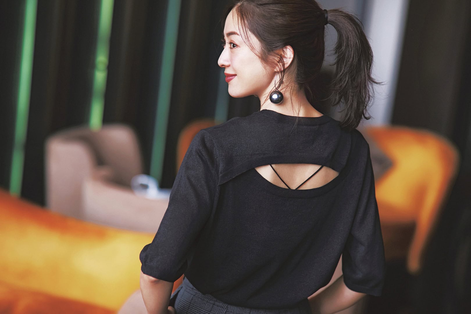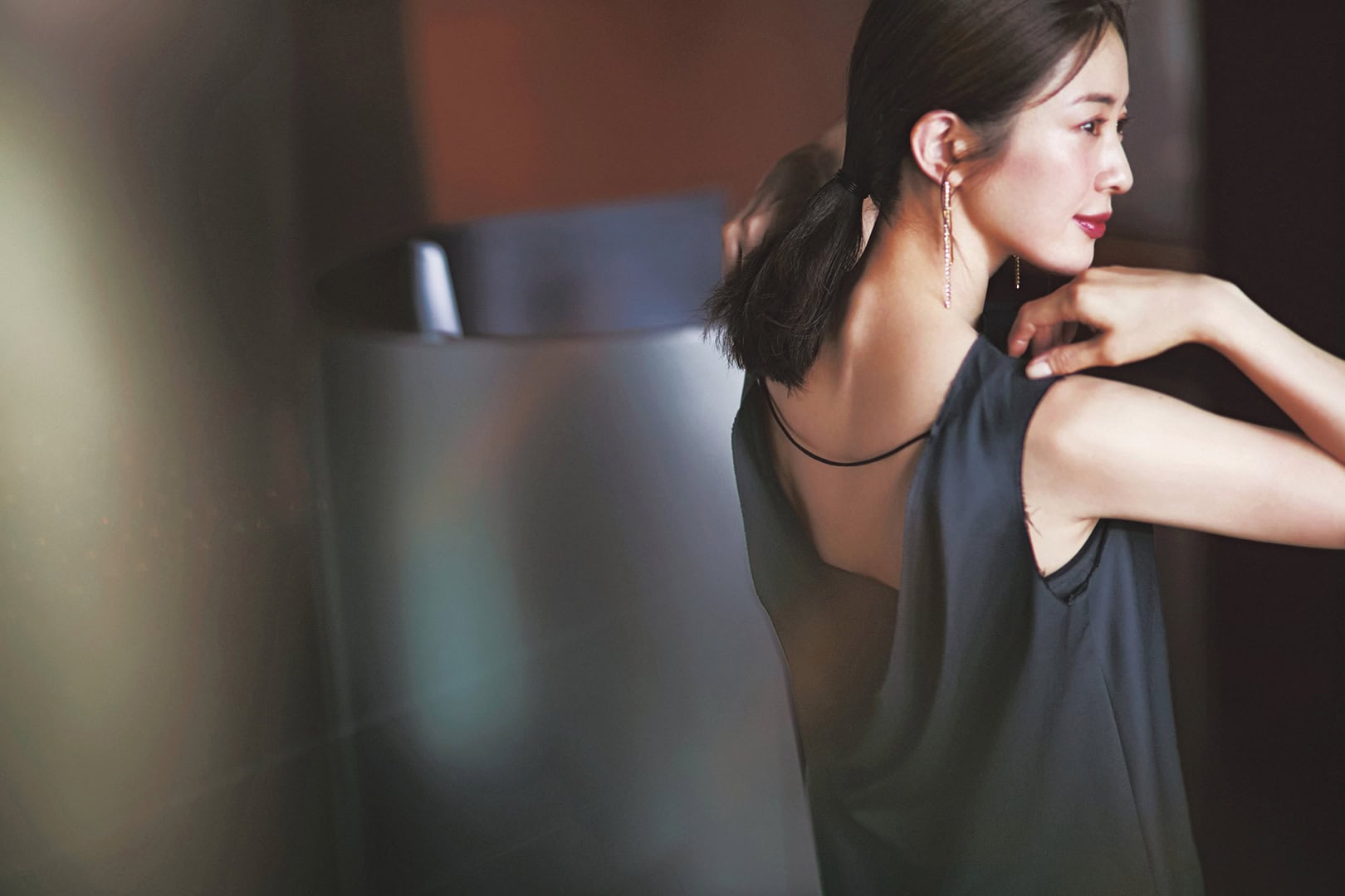 2.華奢なストラップの存在が直接的にならない、上品な背中見せを表現