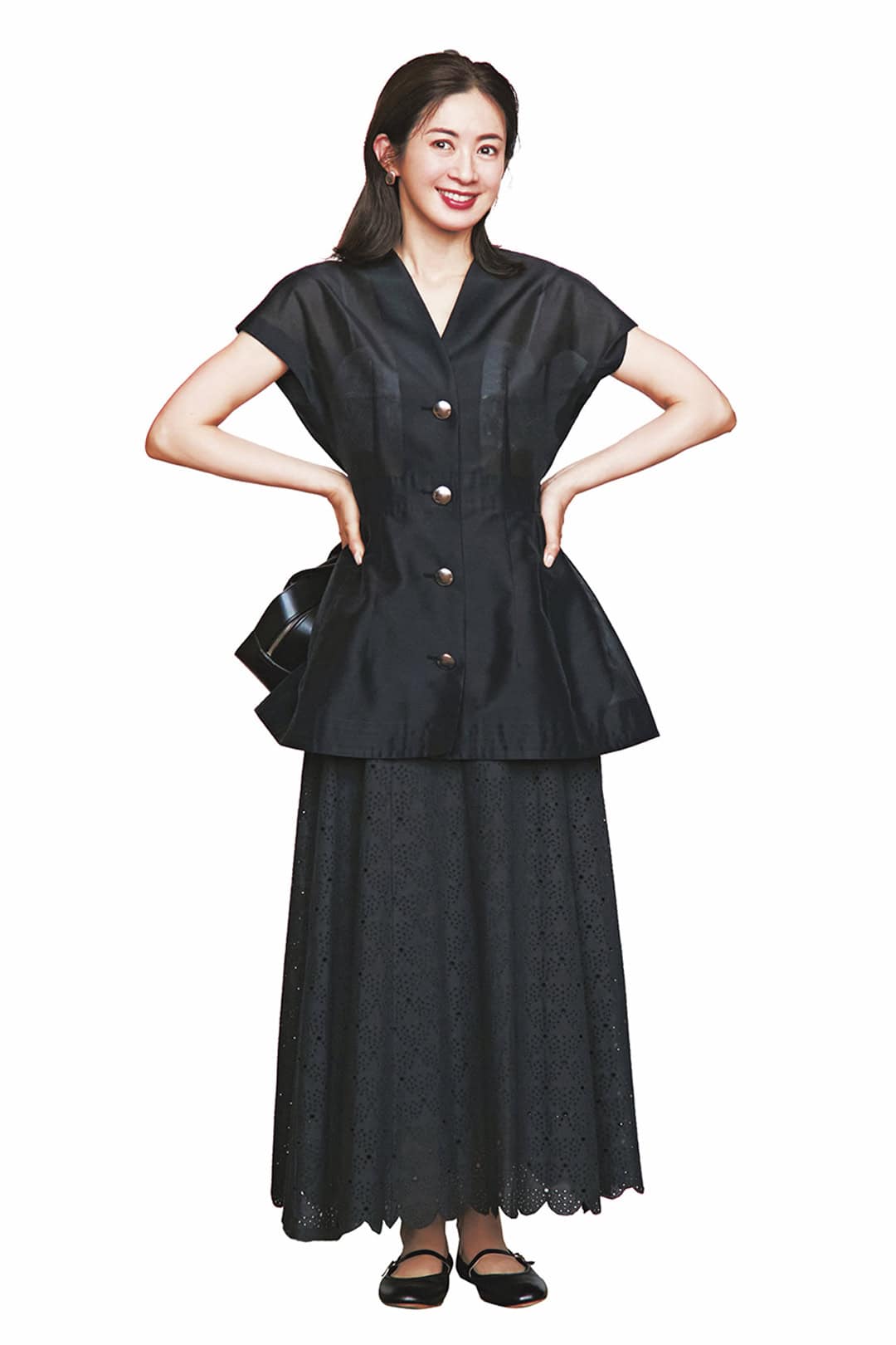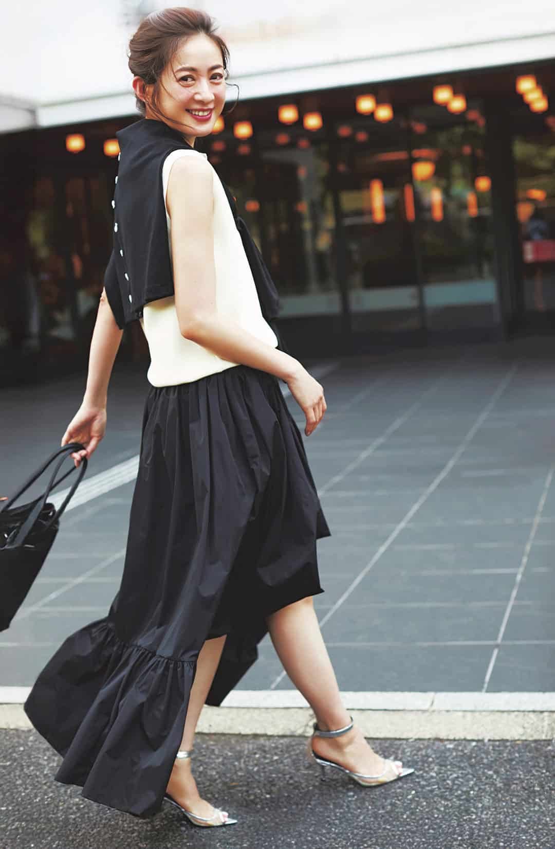 スカート¥46,200肩に巻いたカーディガン¥20,900(ともにシー/エスストア)ニット¥8,470(ミラ オーウェン/ミラ オーウェン ルミネ新宿2店)バッグ¥48,400(ヴァジック/ヴァジック ジャパン) サンダル¥41,800(ピッピシック/ベイジュ)ピアス¥113,300※片耳価格(プライマル)