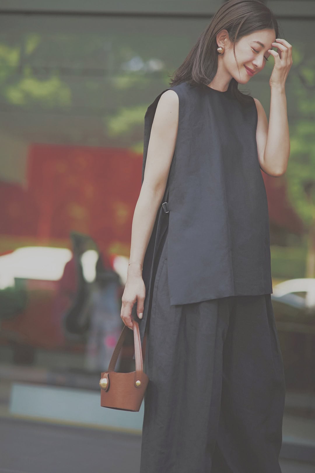 パンツ¥48,400(チノ/モールド) ジャケット¥61,600(シー/エスストア) タンクトップ¥17,600(アイレネ/ルシェルブルー総合カスタマーサービス) バッグ¥86,900(メゾン カナウ/ヤマニ) シューズ¥37,400(ピッピシック/ベイジュ) スカーフ¥13,750(ザ シンゾーン/シンゾーン ルミネ有楽町店) ピアス¥29,700(リューク) ペチパンツ(スタイリスト私物)