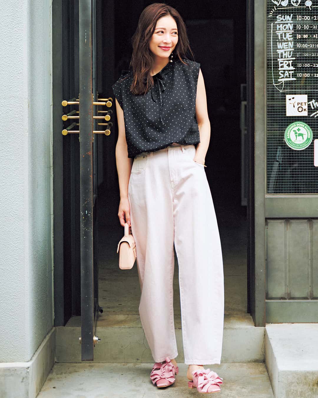 ウエストインが苦手な人にオススメな「ドットバルーントップス」。インしなくてもサマになって、オフィスからお出かけまで幅広いシーンで活躍します。