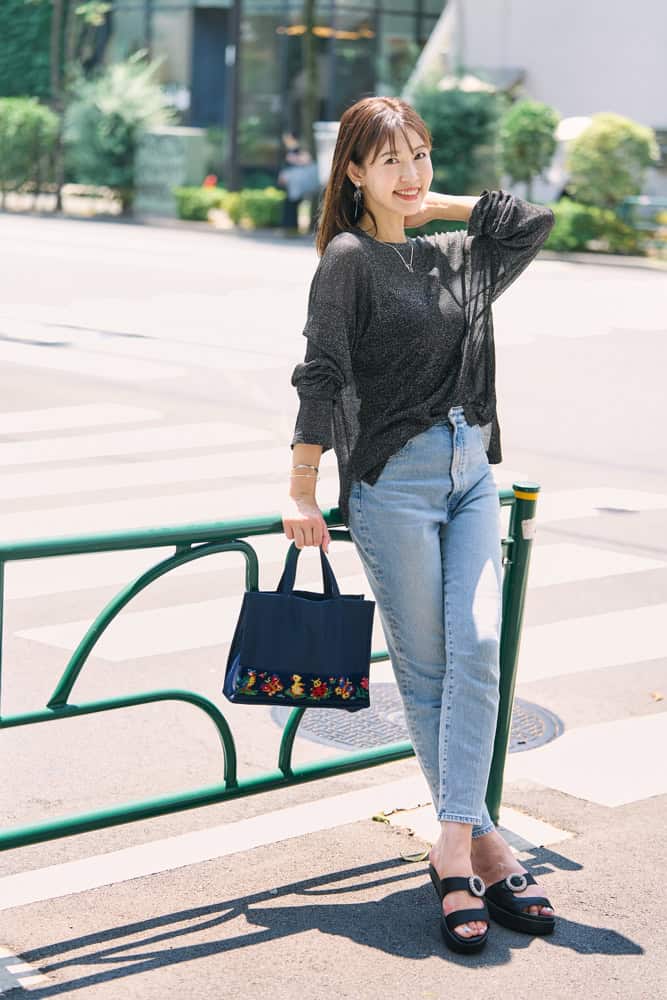 デニムスタイルを華やかにしてくれるシアーラメニット