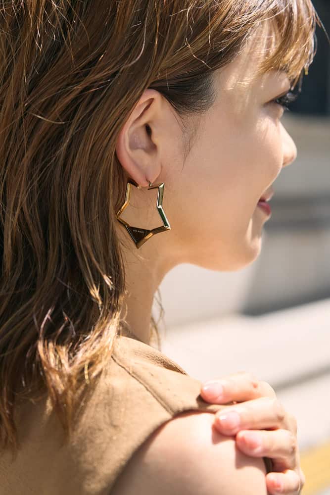 オールインワンは動きやすく楽なので、暑い季節に1番出番が多いアイテムです。こちらのetre tokyoのオールインワンはニット素材で伸びが良いので、リラックスできて移動にもピッタリ。ボリュームのある靴で明るい色のコーデを引き締め、黒レザーの大きめバッグできちんと感をプラスしました。星の形がキャッチーなゴールドのピアスはPRADAで見つけたもの。コーデに華やかなアクセントをプラスできます。