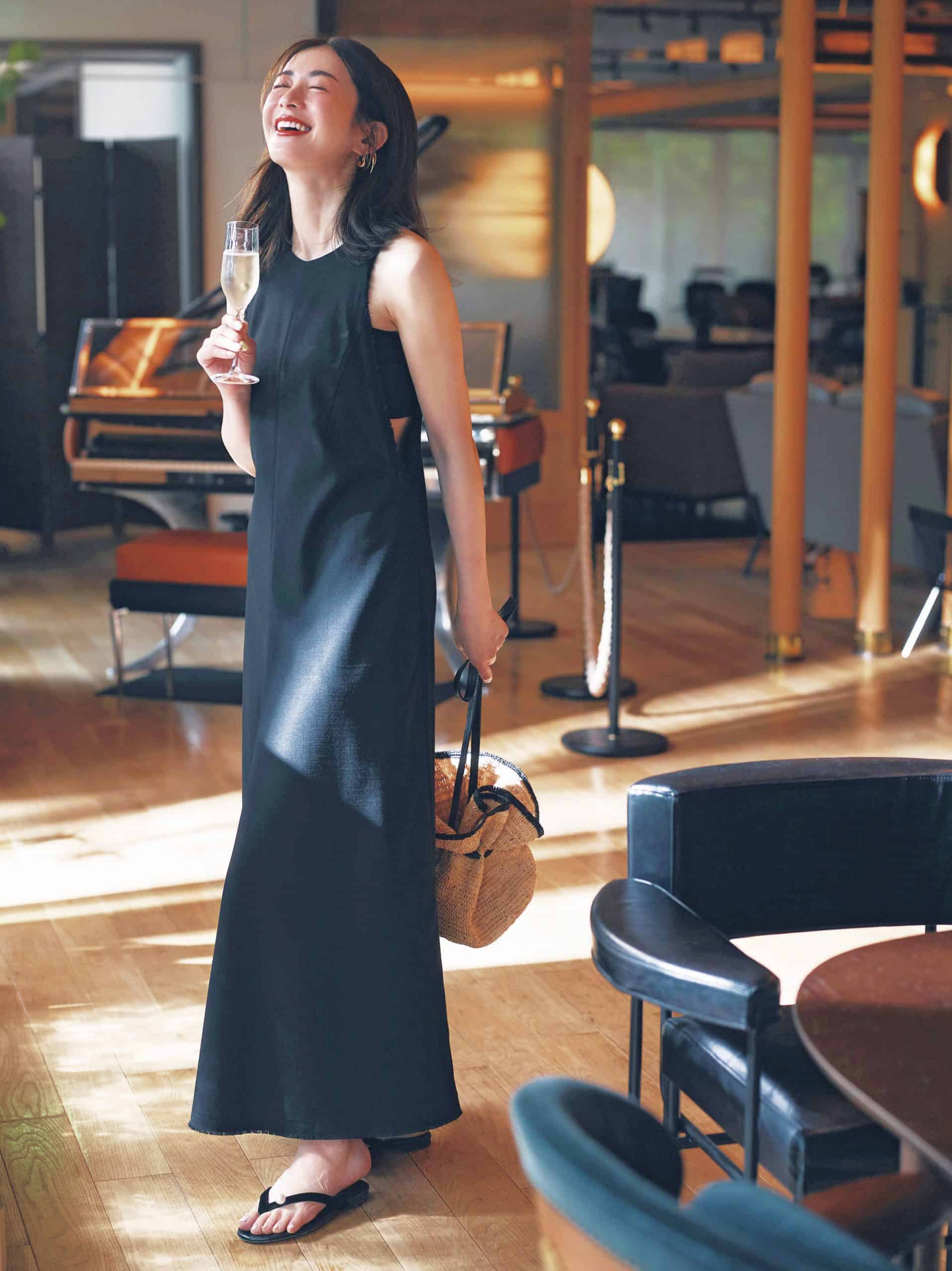 夏の夕飲みに似合うドレッシーな黒のワンピースは、ビーサンでカジュアルダウンすることで逆に大人のこなれた着こなしに。パールが目を惹くビーサンを合われば、露出した足元から繊細な色気が香ります。