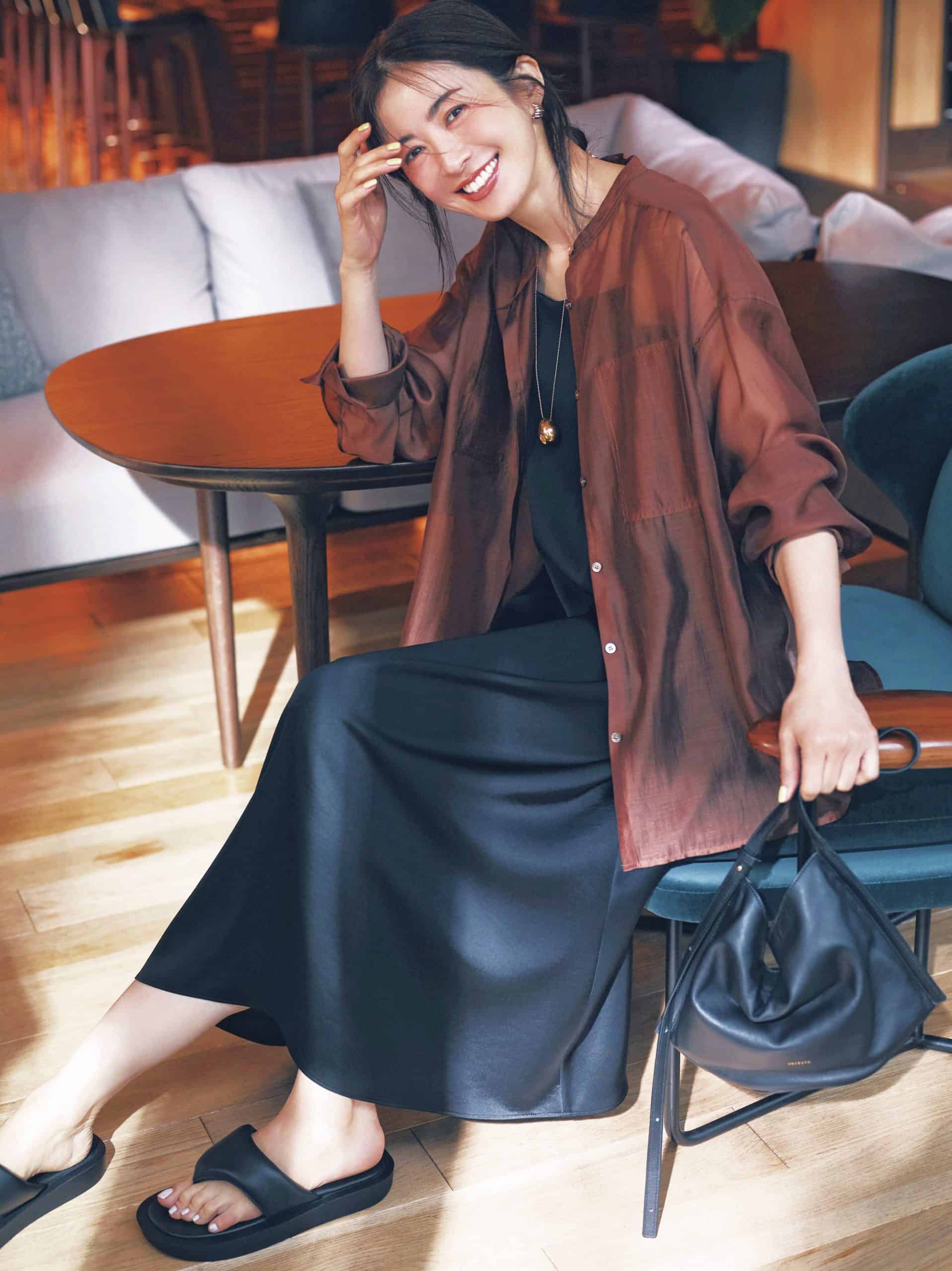 サラッとした生地感のワンピース&シャツには、ぽてっとしたビーサン型のサンダルとレザーバッグを合わせて異素材の対比を楽しんで。シアーシャツとサンダルによる肌見せで、コーデにほどよい抜け感をプラスします。シアーシャツは意外と汎用性高めのブラウンで、秋まで活躍してくれそうなのもうれしい。