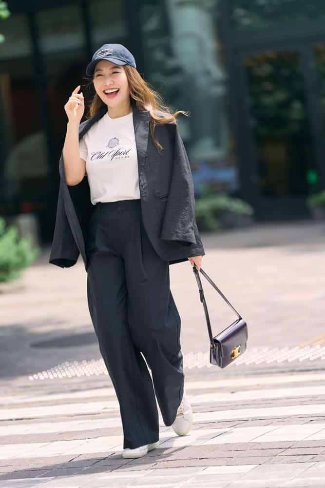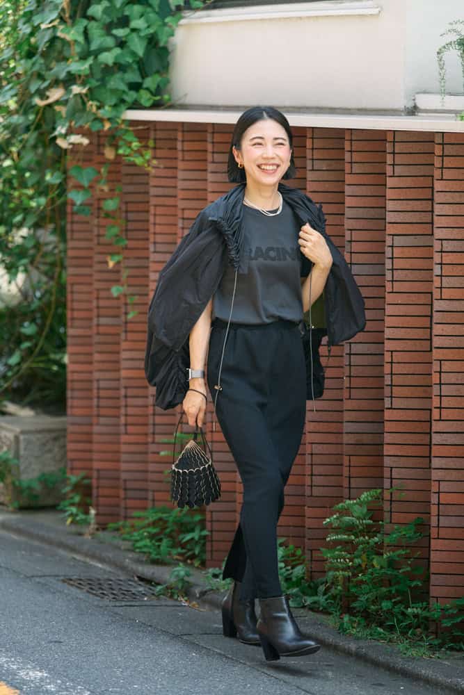 シルエットとUネックのラインがきれいで気に入っているTシャツは、シルクのような質感がカジュアルスタイルを上品に仕上げてくれます。夏はサンダル合わせでしたが、足元をパンプスに変え、ジャケットをプラスすることで、秋らしさを感じられるようなコーデにしました。Tシャツに合わせてバッグと靴も黒でまとめ、全体に統一感を出しています。