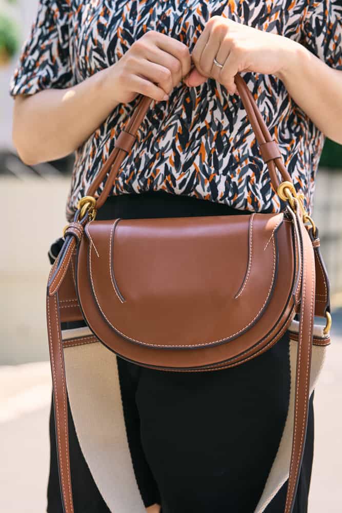 肩の控えめなフリル使いが気に入っている柄Tシャツは、夏は白ショーパンやデニムでカジュアルに着ていましたが、秋になっても活躍してくれる1枚。今日は黒を合わせて大人っぽい雰囲気に。ジャケットを羽織ってショートブーツで重さをプラスすれば、秋っぽいコーディネートが完成します。ブラウンレザーのバッグは、Tシャツの柄と色を合わせて統一感を出しました。