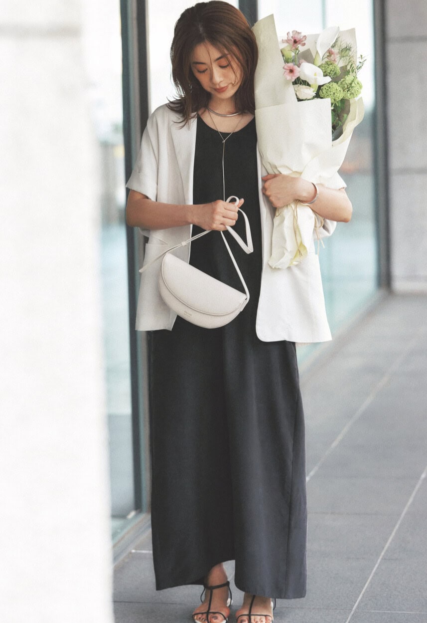 ワンピース¥39,600(サロン アダム エ ロペ)ジャケット¥24,970(FRAY I.D/FRAY I.D ルミネ新宿2店)バッグ¥33,000(ラシット/ラシット 西銀座店)サンダル¥59,400(ブレンテッラ/ハウス オブ ロータス)ブレスレット¥33,000チョーカー¥86,900〈ともにニナ・エ・ジュール〉チェーンネックレス¥33,000〈マッソーズアンドマッソーズ〉(すべてショールーム ロイト)