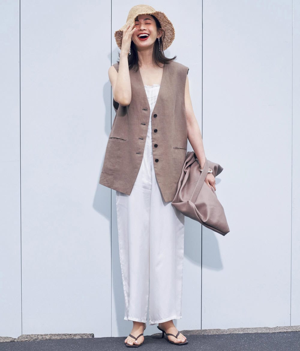 蒸し暑い日はサラッとした着心地のゆるサロペでストレスフリーに。気になる脇や腰回りは優秀ジレを羽織ってオシャレにカバー。薄肩パッドが肩をほんのり浮かせてくれるから二の腕もほっそり♪ 凛としたジレの直線ラインでリラクシーコーデも都会的に決まります。