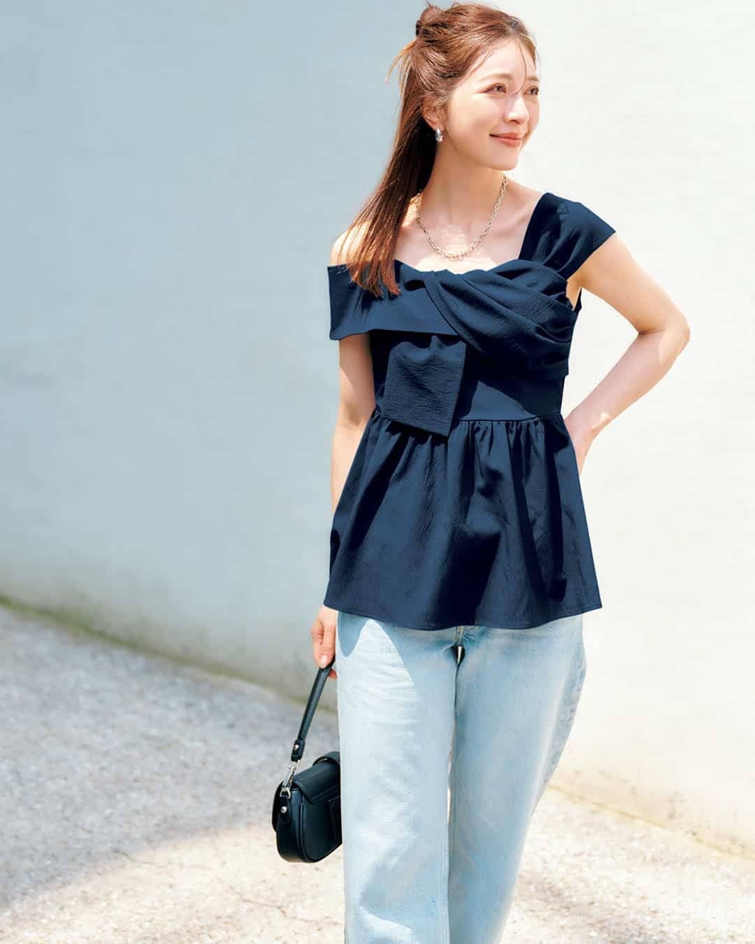 大人のデコルテを優美に見せてくれるリボンデザイントップスは5,000円台と高コスパ。アシンメトリーなデザインでモードに肌見せを楽しめます。どんなボトムスもたちまちドレスアップしてくれるから夏のワンツーコーデの心強い味方に! ネイビーなら品よく着こなせそう♪