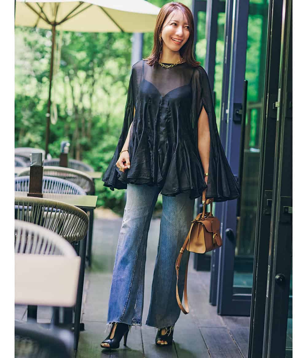 シアートップスでデニムもエレガントに。デニムは形がキレイに見えるリダンがイチ押し。カジュアルに寄りすぎないようにトップスは黒の重さを軽減するシアー&ヒールを合わせて優しげアップ。