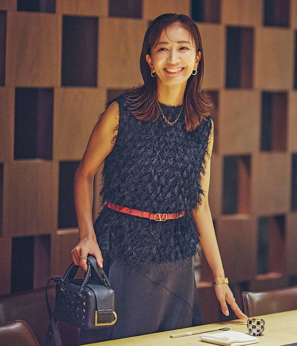 フェザー×レッドで艶やかに上品映え。オールブラックは異素材合わせで表情豊かに洗練感もUP。歩くと動きがでる女っぽスカートがお気に入り。ジュエリーは夜に華やかに映えるゴールド一択。