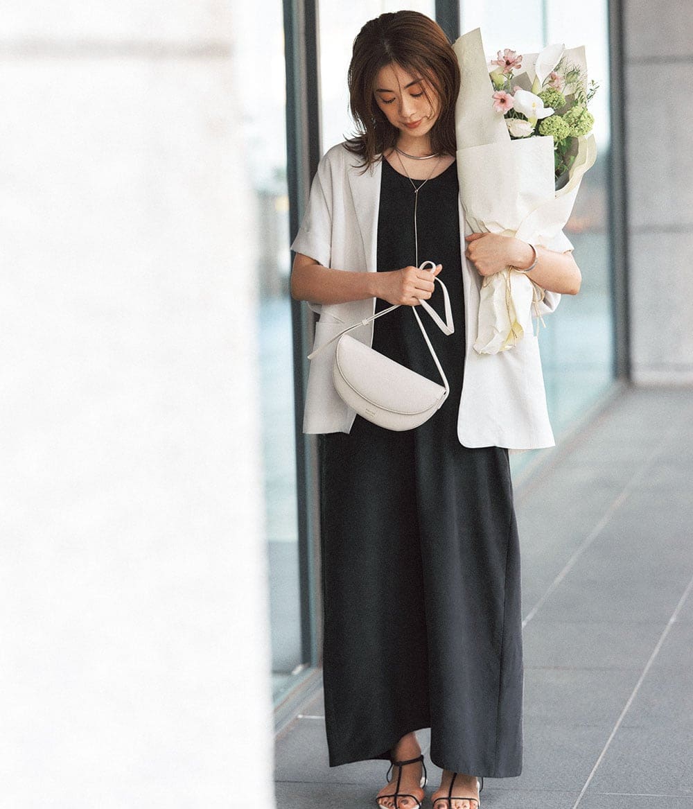 ワンピース¥39,600(サロン アダム エ ロペ)ジャケット¥24,970(FRAY I.D/FRAY I.D ルミネ新宿2店)バッグ¥33,000(ラシット/ラシット 西銀座店)サンダル¥59,400(ブレンテッラ/ハウス オブ ロータス)ブレスレット¥33,000チョーカー¥86,900〈ともにニナ・エ・ジュール〉チェーンネックレス¥33,000〈マッソーズアンドマッソーズ〉(すべてショールーム ロイト)