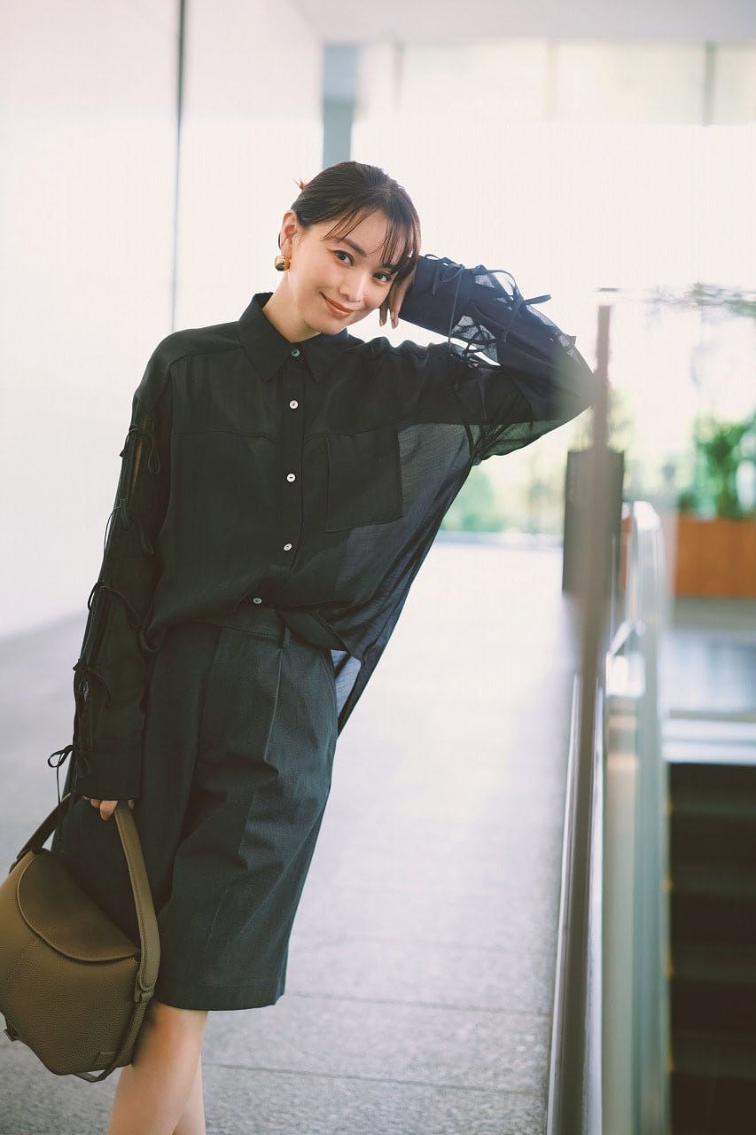 ハリのあるボクシーなシルエットが魅力のハーフパンツは、脚をほっそり見せてくれる効果が。膝上の丈も、黒ならカジュアルになりすぎず、上品な印象に仕上がります。トップスは長袖で露出のバランスを調整しつつ、ビッグシルエットのシアーシャツなら涼しげに。長袖でも軽やかで、コーデに奥行きをだしやすく、さらに着回し力も今っぽさも高い黒のシアーシャツは、今夏から秋中まで大活躍しそう。