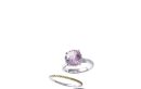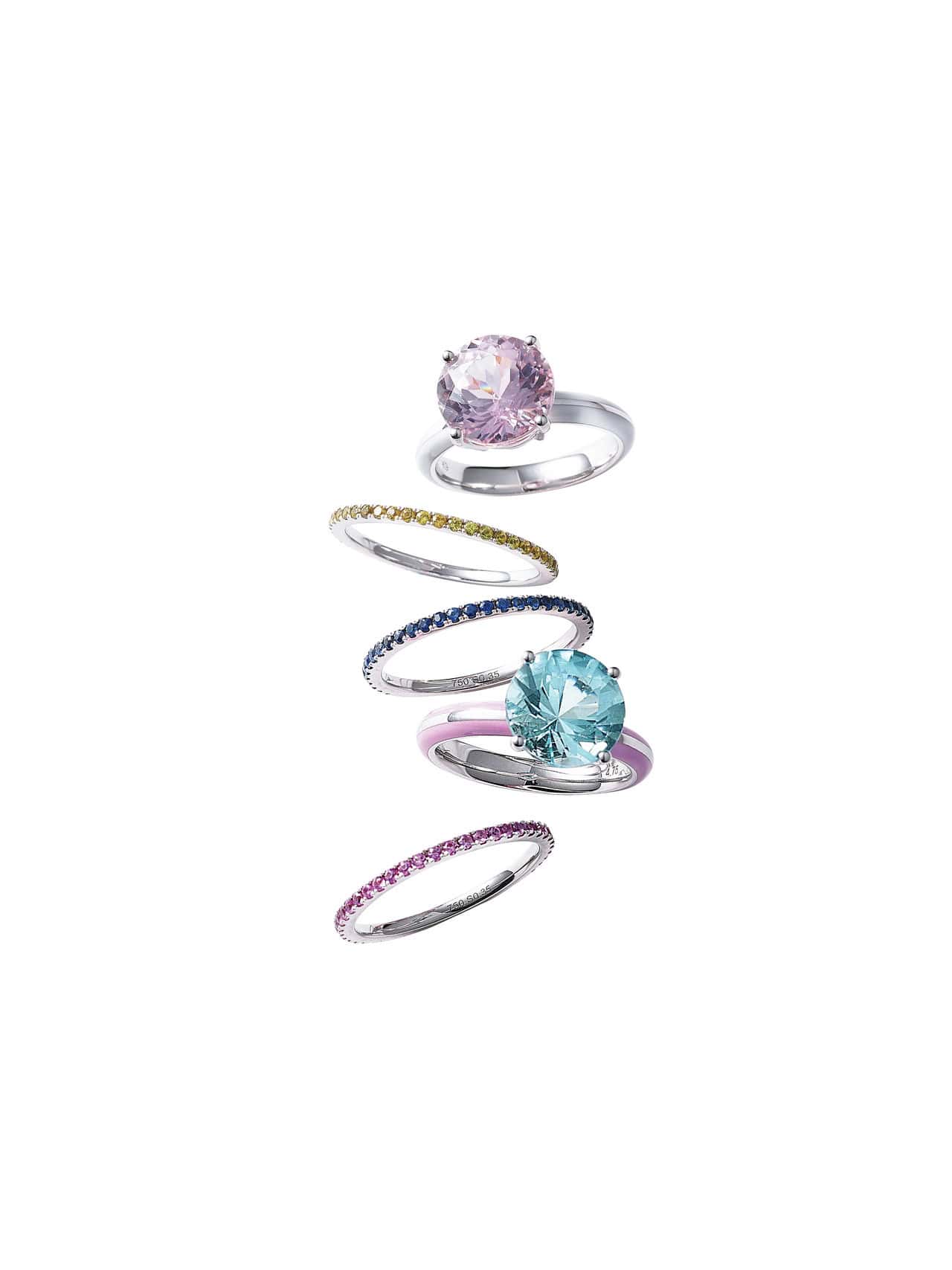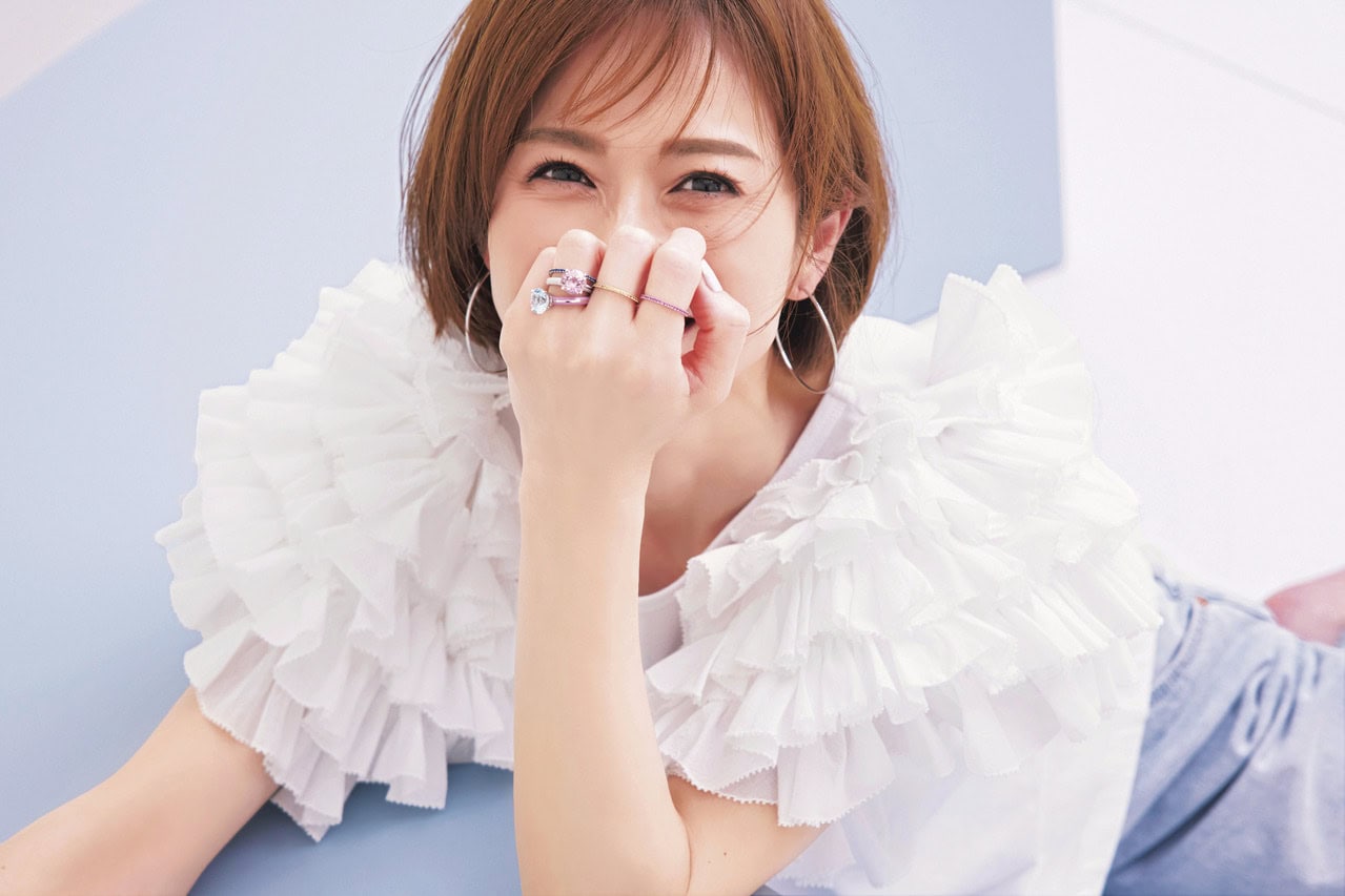 人差し指につけたリング〈ピンクダイヤ〉¥176,000 中指につけたリング〈イエローダイヤ〉¥165,000 薬指に重ねづけたリング〈指先・ブルーダイヤ〉¥165,000薬指に重ねづけたリング〈中央・9KWG × クンツァイト〉¥396,000薬指に重ねづけたリング〈つけ根・9KWG × ブルートパーズ〉¥214,500ピアス(片耳売り)〈18KWG × ブラウンダイヤ〉各¥316,800(すべてオー/ハルミ ショールーム)Tシャツ¥24,200(アユーシ/エヌディシージャパン) デニムパンツ¥23,100(ローラス/ジャック・オブ・オール・トレーズ プレスルーム)